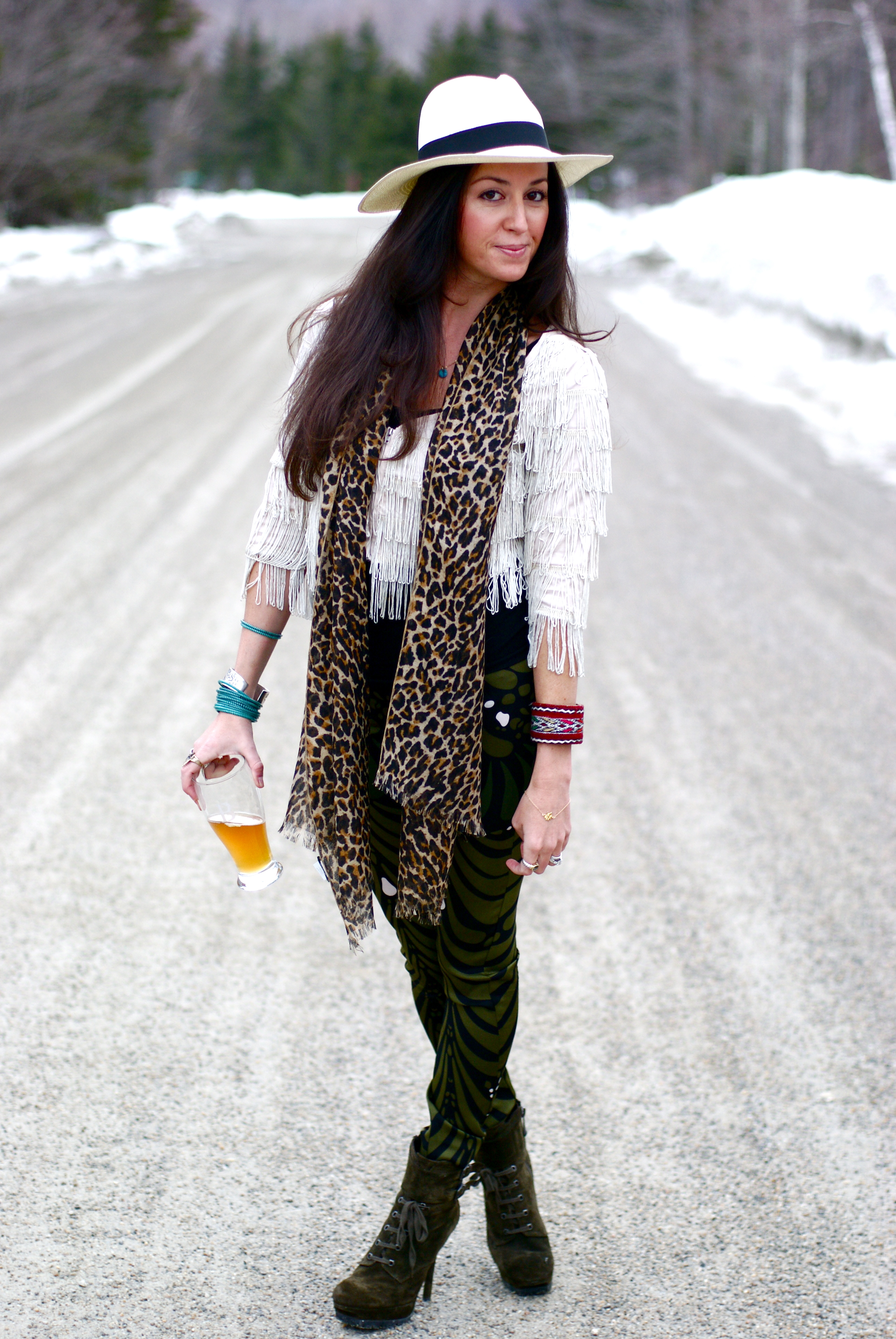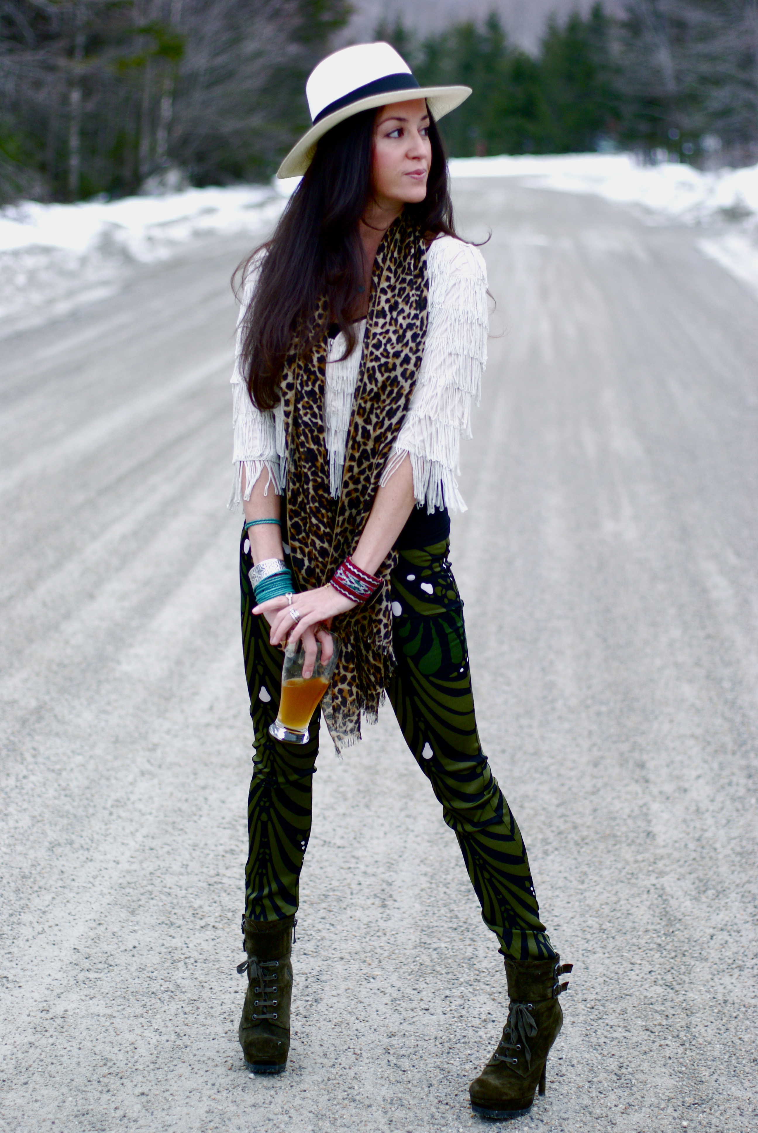 [Mara Hoffman silk pants + Sam Edelman boots + ASOS jacket + J.Crew scarf and hat + Motif 56 cuff, Low Luv cuff, Made with Love bracelets + Gorjana pendant.]