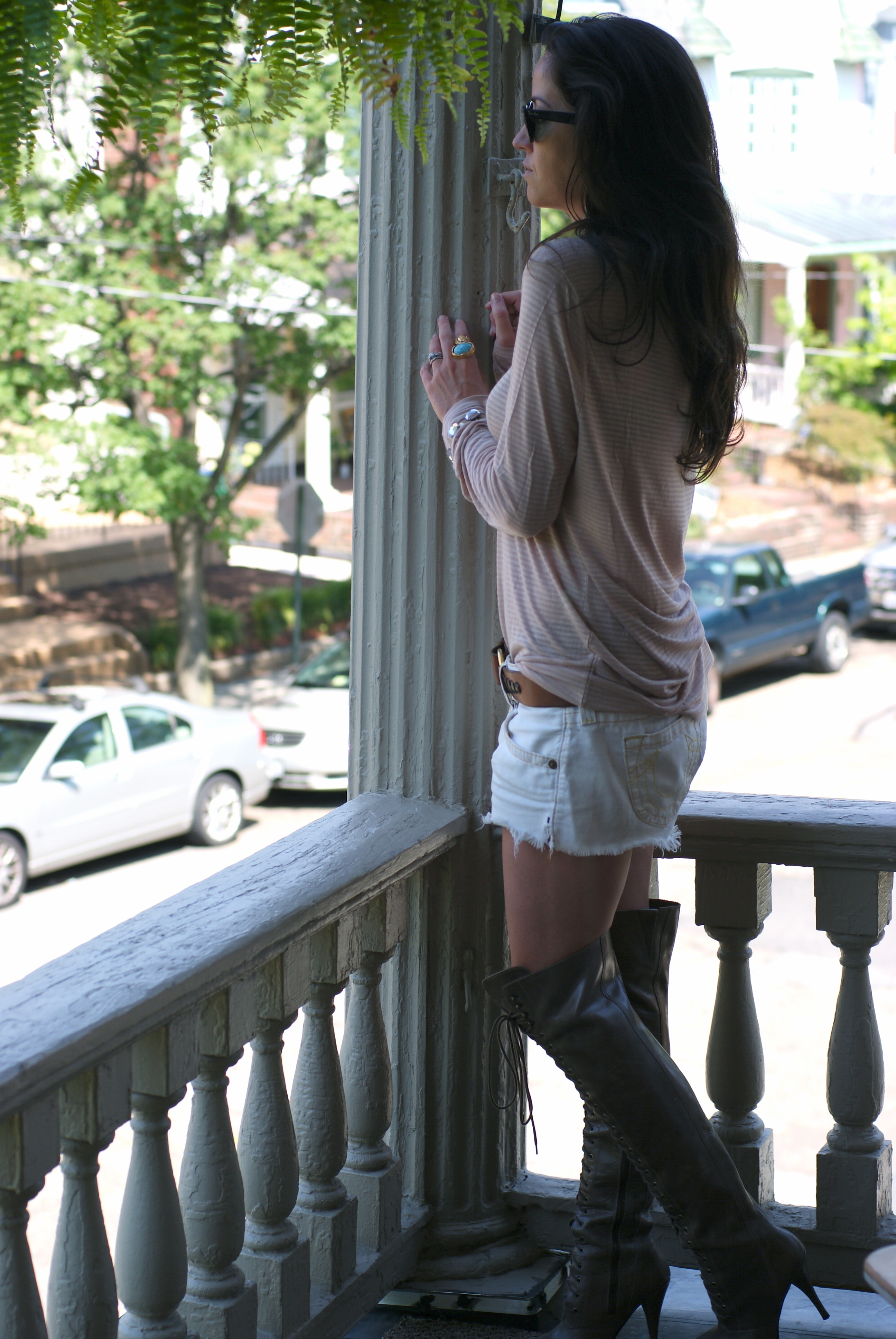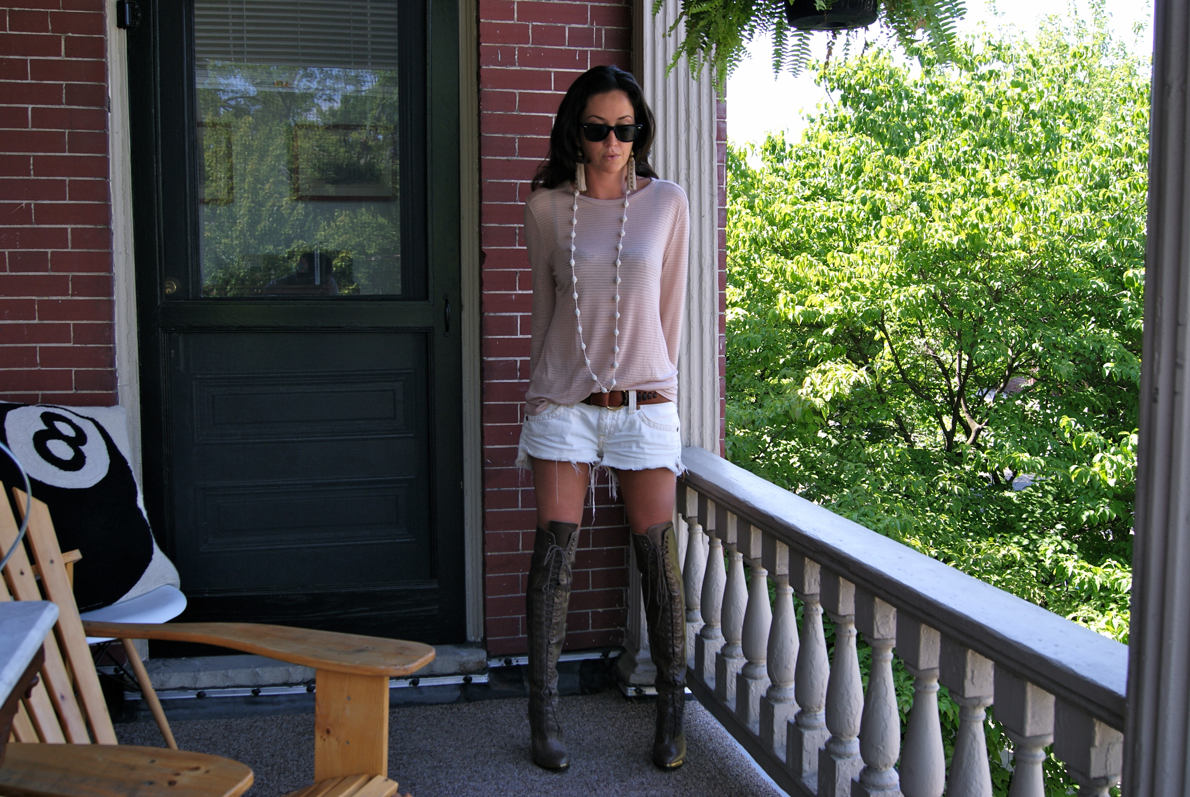 [Zee porch: T by Alexander Wang t-shirt + Made with Love necklace + Joie boots + TR cut offs. Told you: it’s all faded shirts/cutoffs for me right now.]
