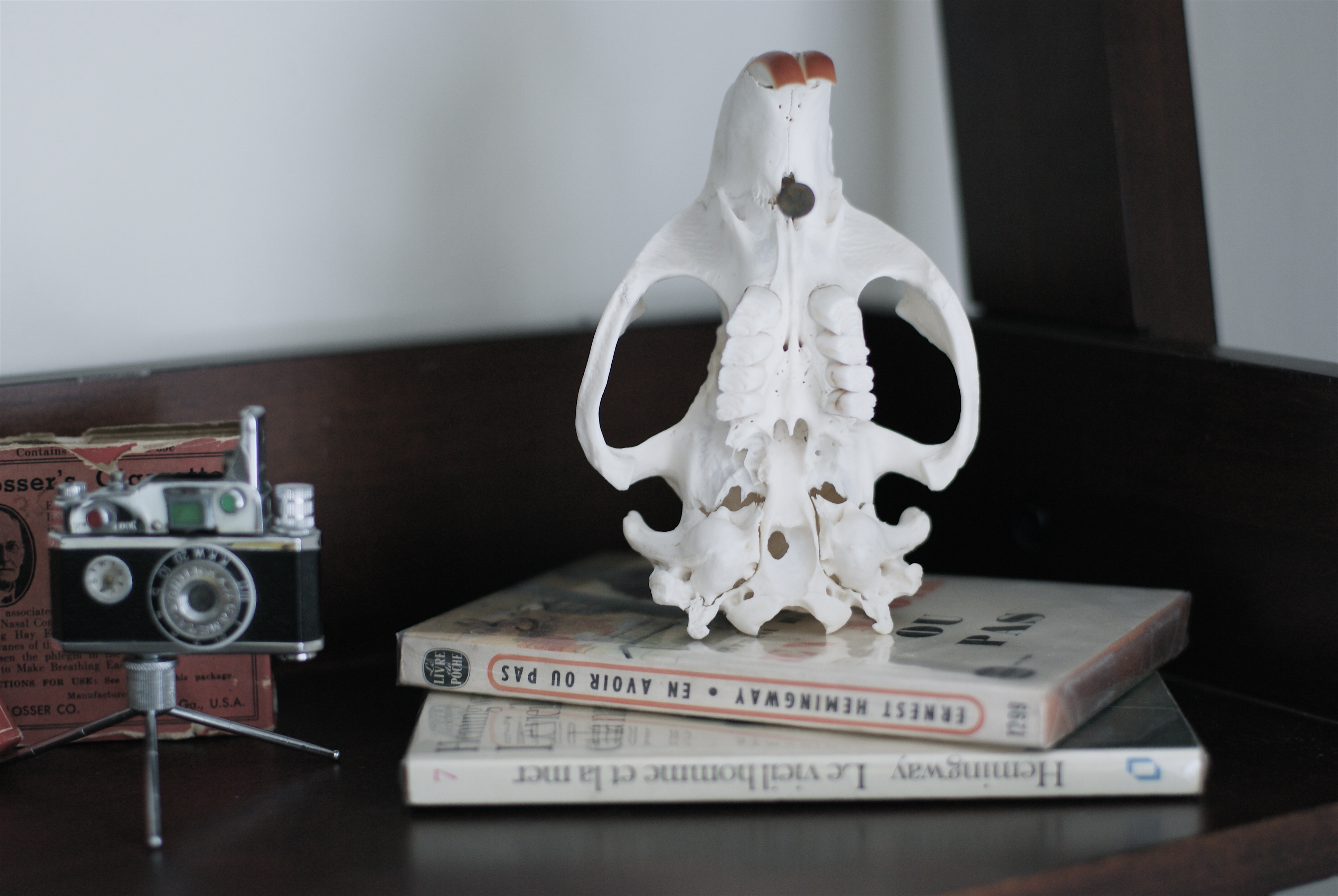 Beav skull, finally bleached + antique copies of Hemingway book purchased by the Seine: