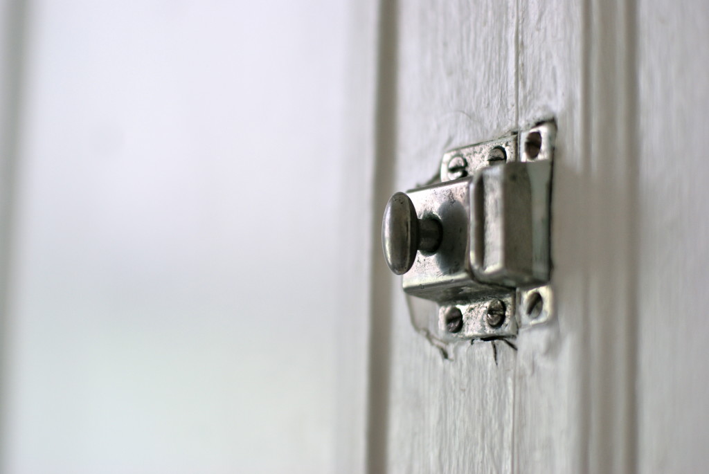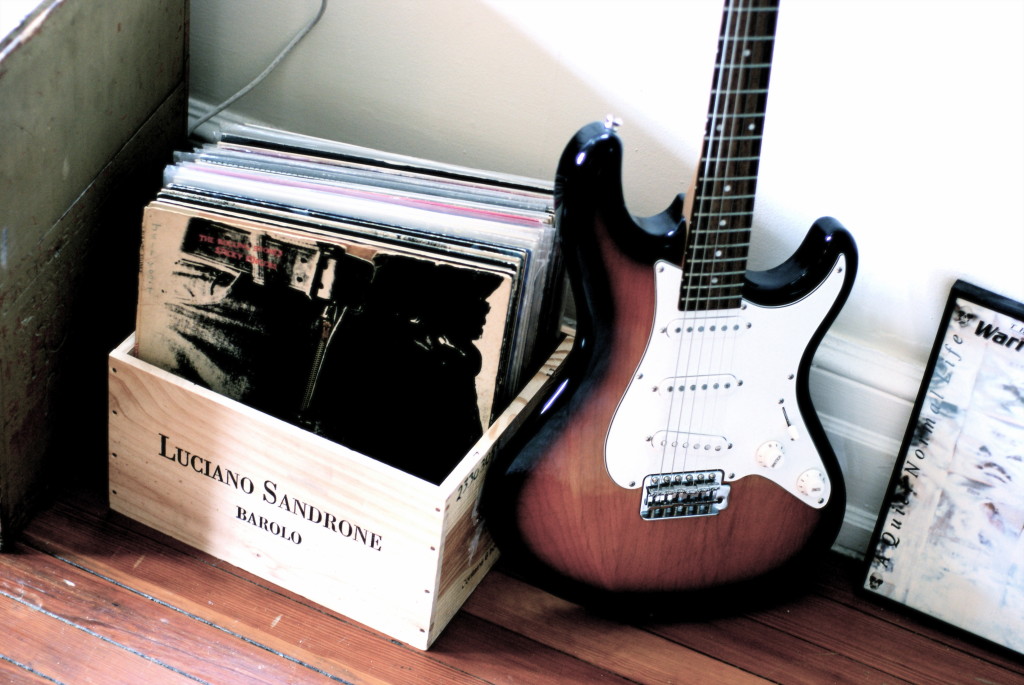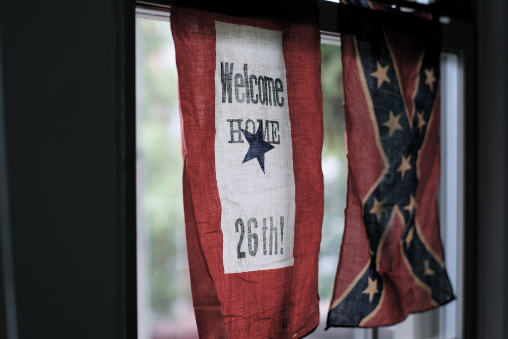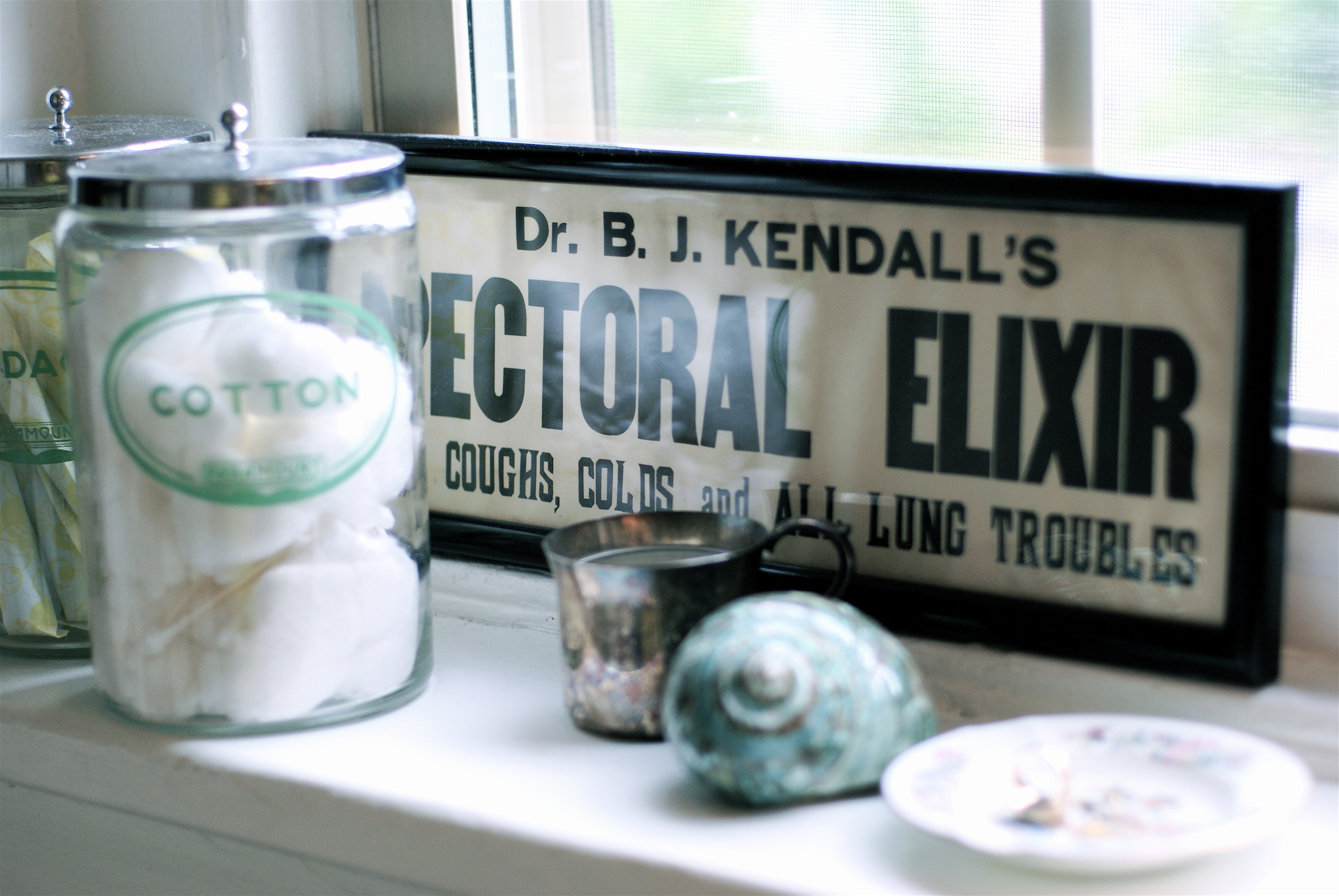 [I spy, with my little eye: a WWII helmet, a 1960s leather U.S. Mail carrier bag, an antique flag, a too-ample collection of corks.]