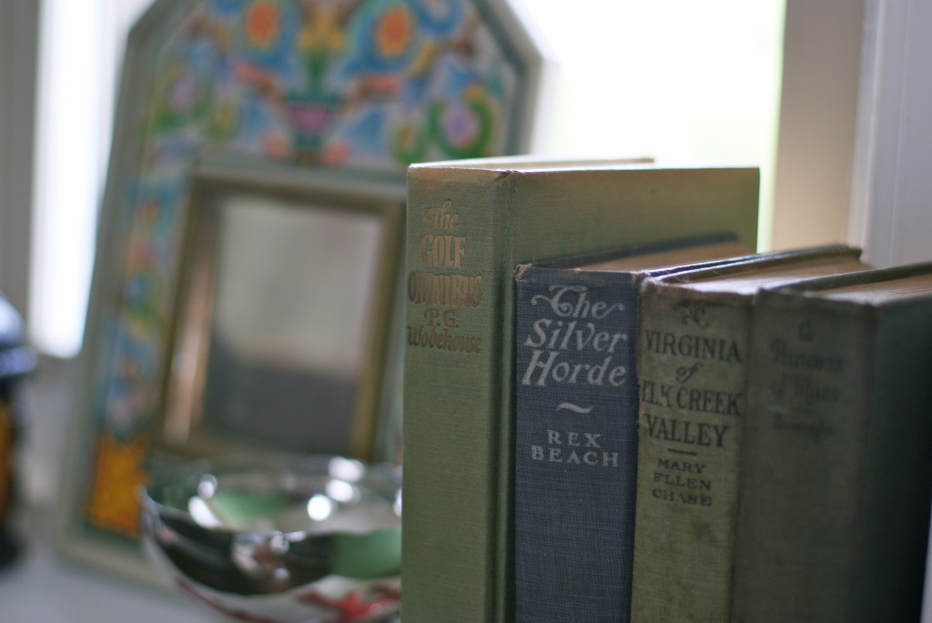 Some of Carey’s favorite books + a mirror from her travelling grandparents that says, “Bought in MOROCCO. With love, Granny and Grandpa.”