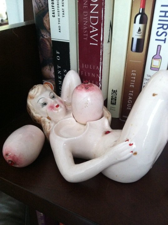 She was already at a disadvantage because her enormous breasts barely fit into her chest cradle simultaneously, and she held no salt or pepper for ballast. They touch naturally in the middle, so one will always be off balance. The earthquake was just enough to send one toppling. Luckily the nipple and bellybutton rubies stayed secured.