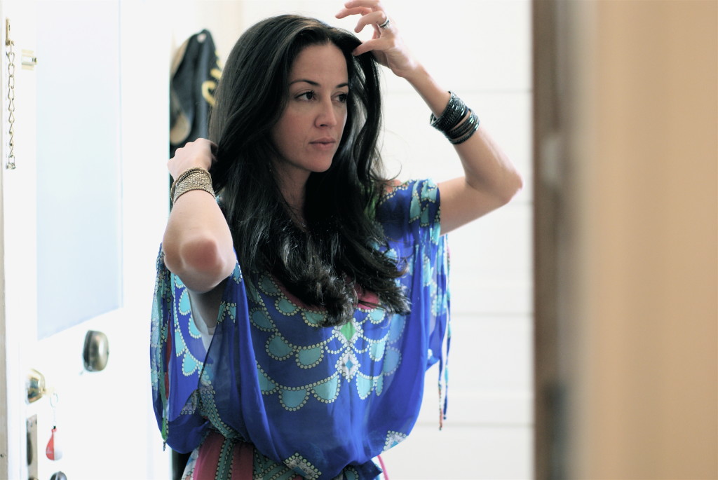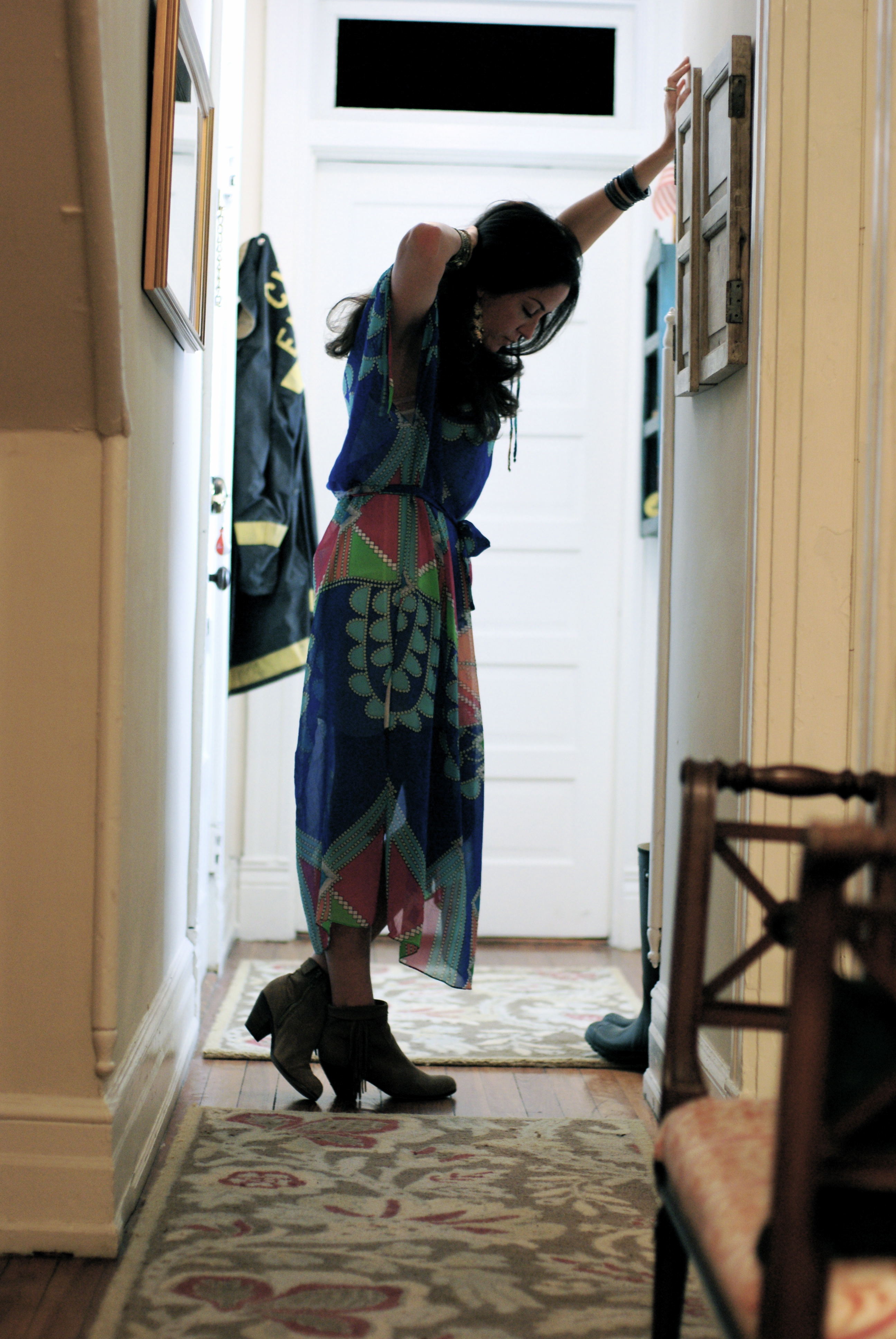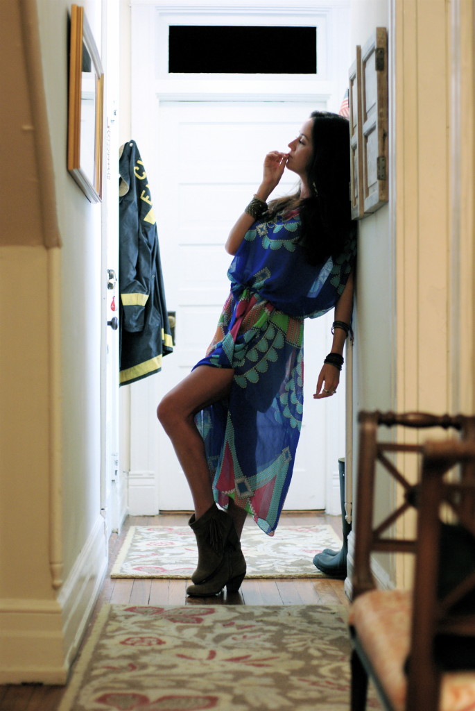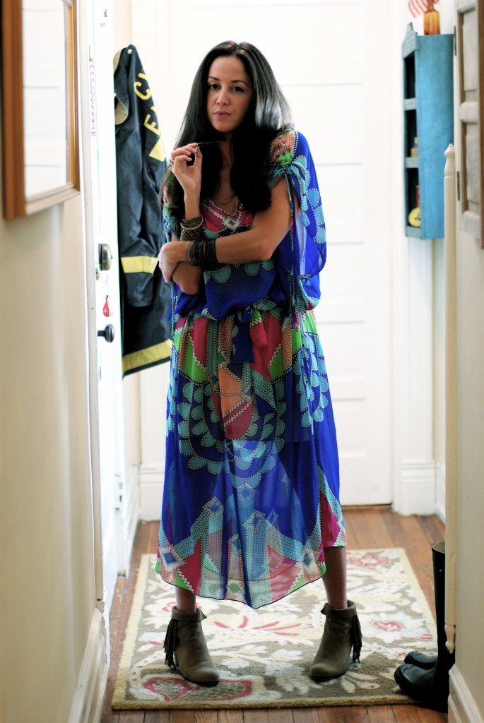 [Quite possibly admiring my own reflection mid-photo in a Mara Hoffman caftan + Sam Edelman booties.]