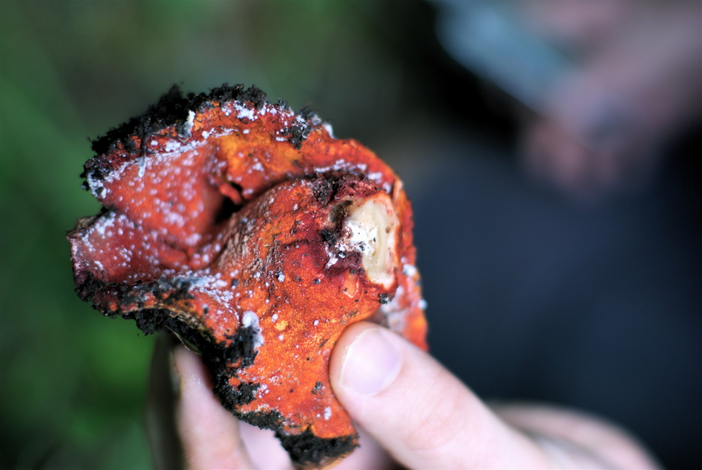 Further up the trail we experienced a rare treat: Dan, our guide and expert, pointed out a cluster of small orange bumps breaking through the moss, something I’d already walked right past. Shrumps, I believe. Like a cross between stump and mushroom, pertaining to a largely hidden fungi in the moments before an escape from the forest floor. I could be totally wrong about that, so don’t just throw that word around haphazardly.