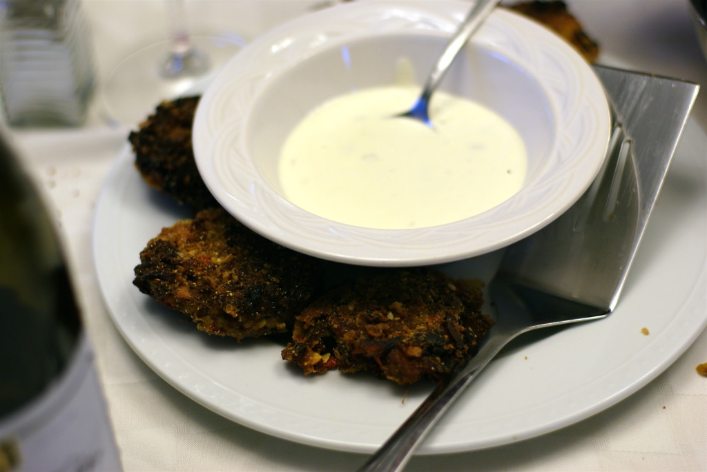 [Crab cakes, sans crab, made with lobster mushrooms. Lobster mushrooms are not really mushrooms, but actually a parasitic ascomycete that grows around and engulfs other mushrooms proper.]
