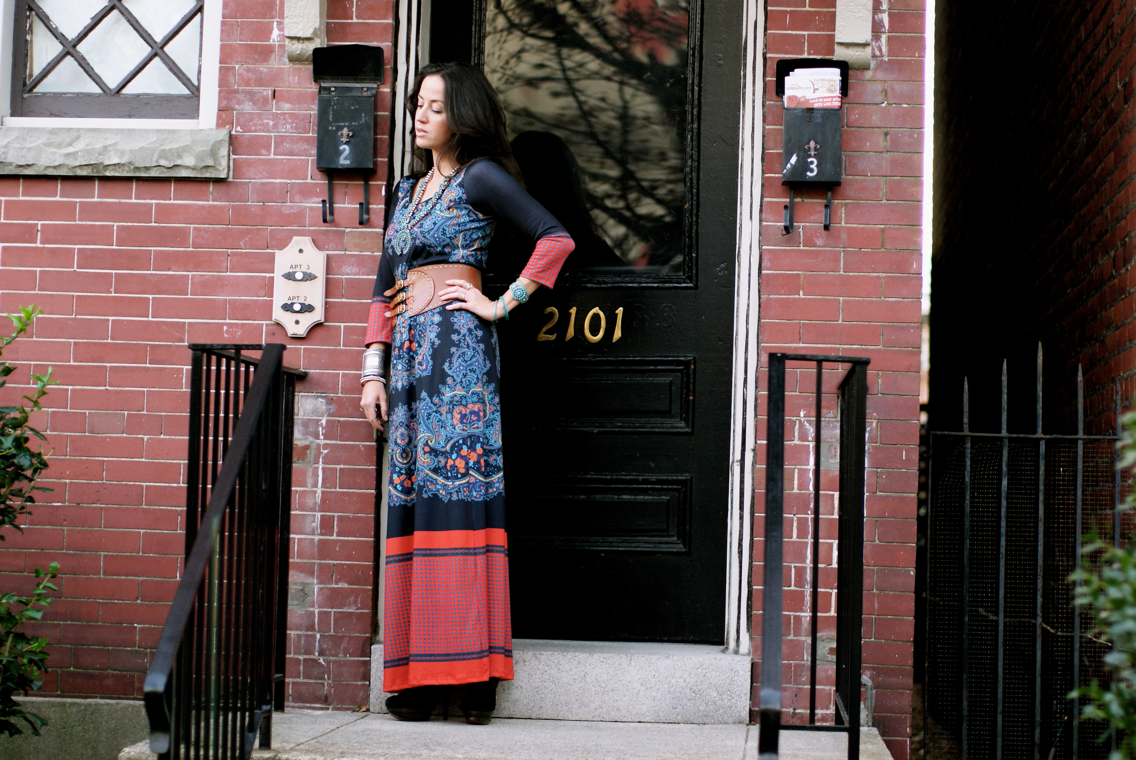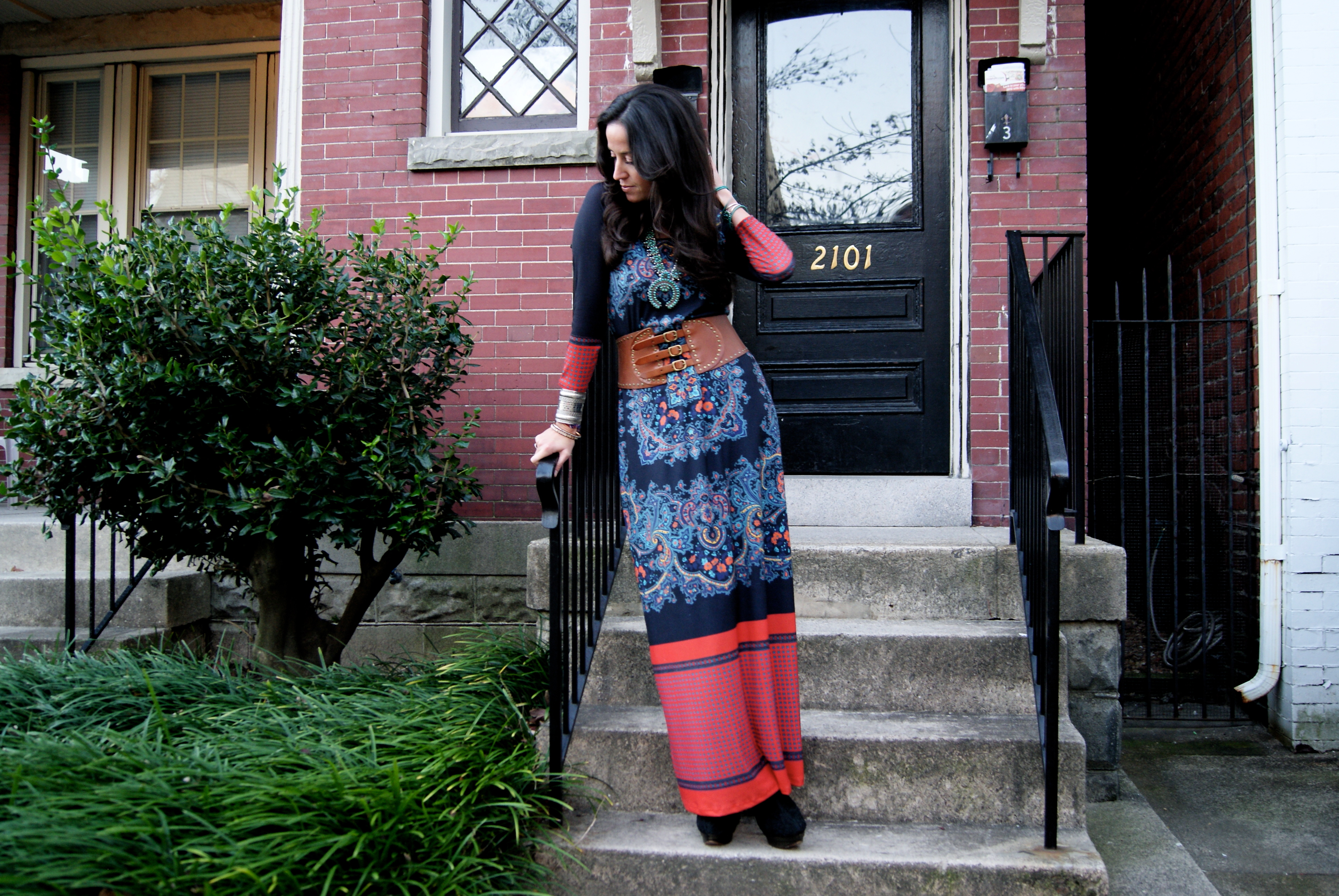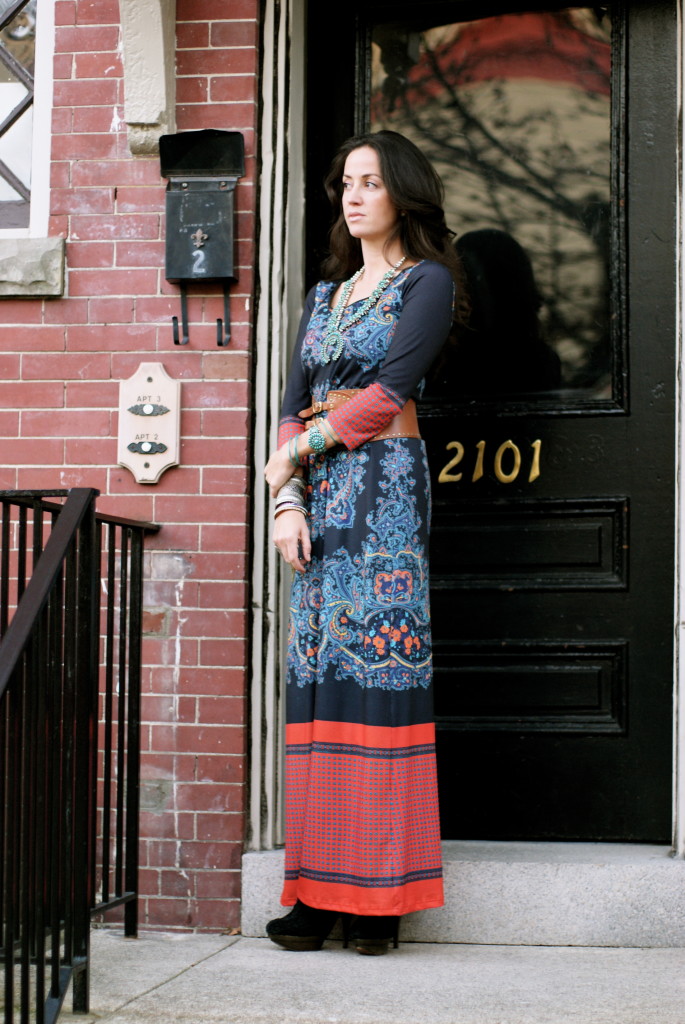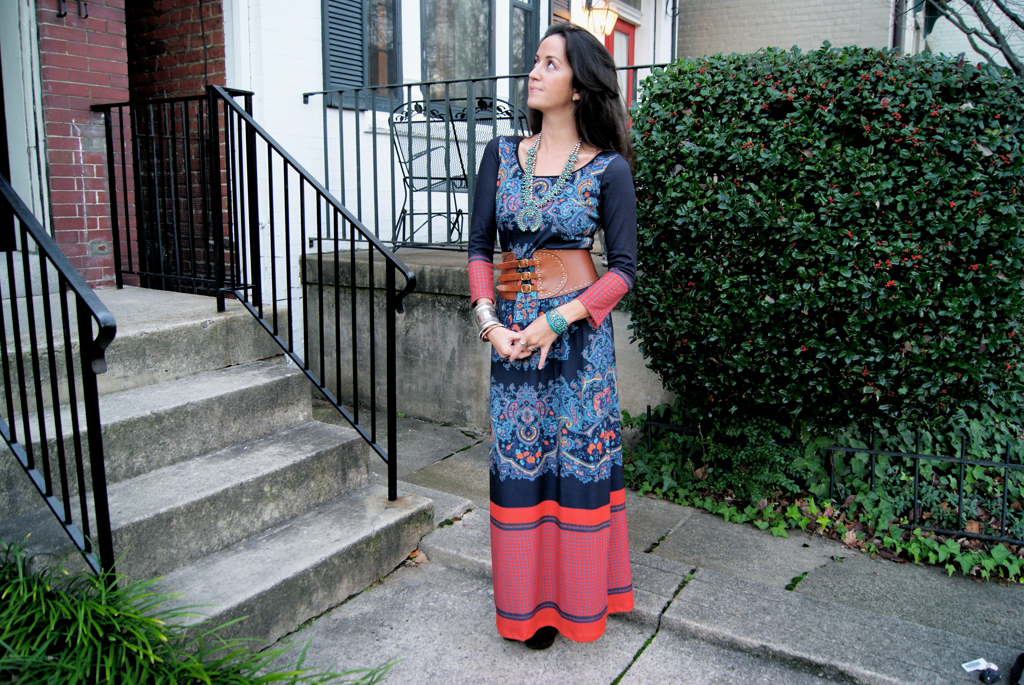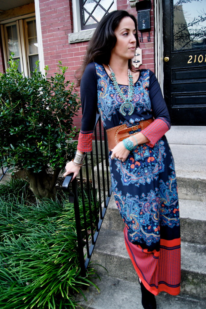 [Acknowledging Eli screaming from the balcony in Anthro dress + vintage squash blossom necklace + Elizabeth and James heels.]