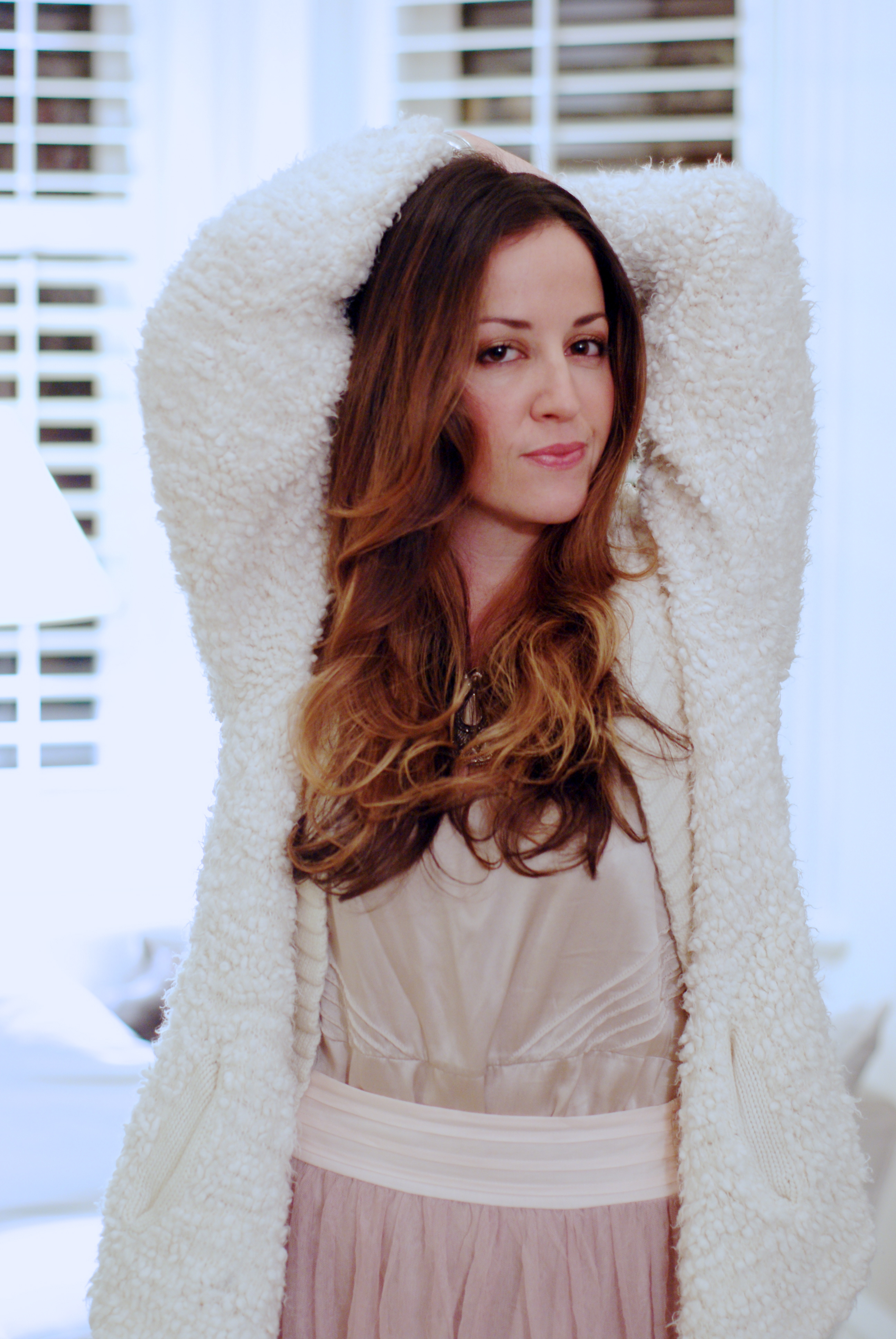 [Free People tulle skirt + Sigerson Morrison booties + silk nightgown + Anthropologie fuzzy cardigan, sized up + layered Vanessa Mooney necklaces… Mooney on Mooney. I’ll get over it someday.]