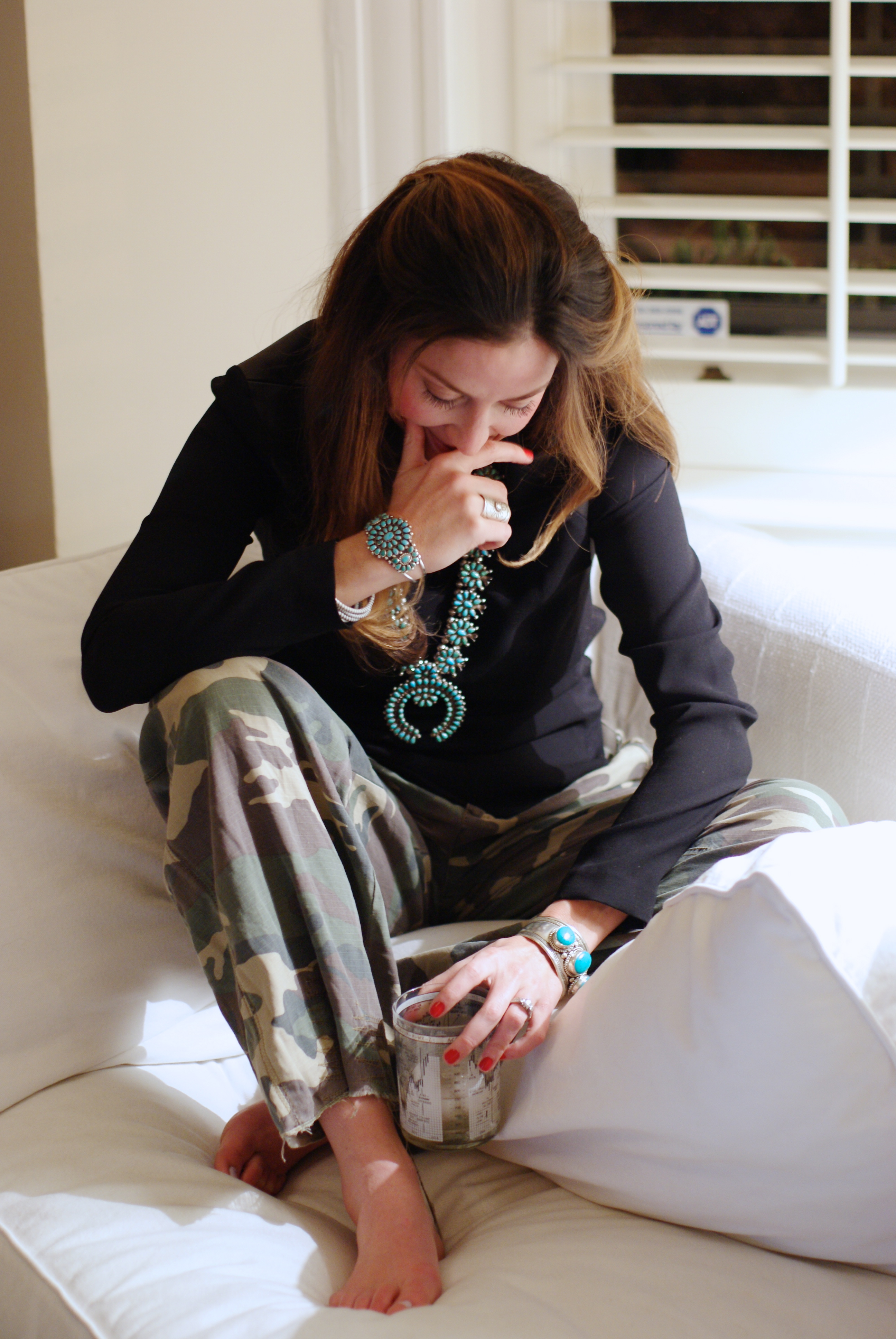 [Da Nang silk camo pants + Rag & Bone leather shoulder blouse + antique squash blossom necklace + Vanessa Mooney cuff and ring.]