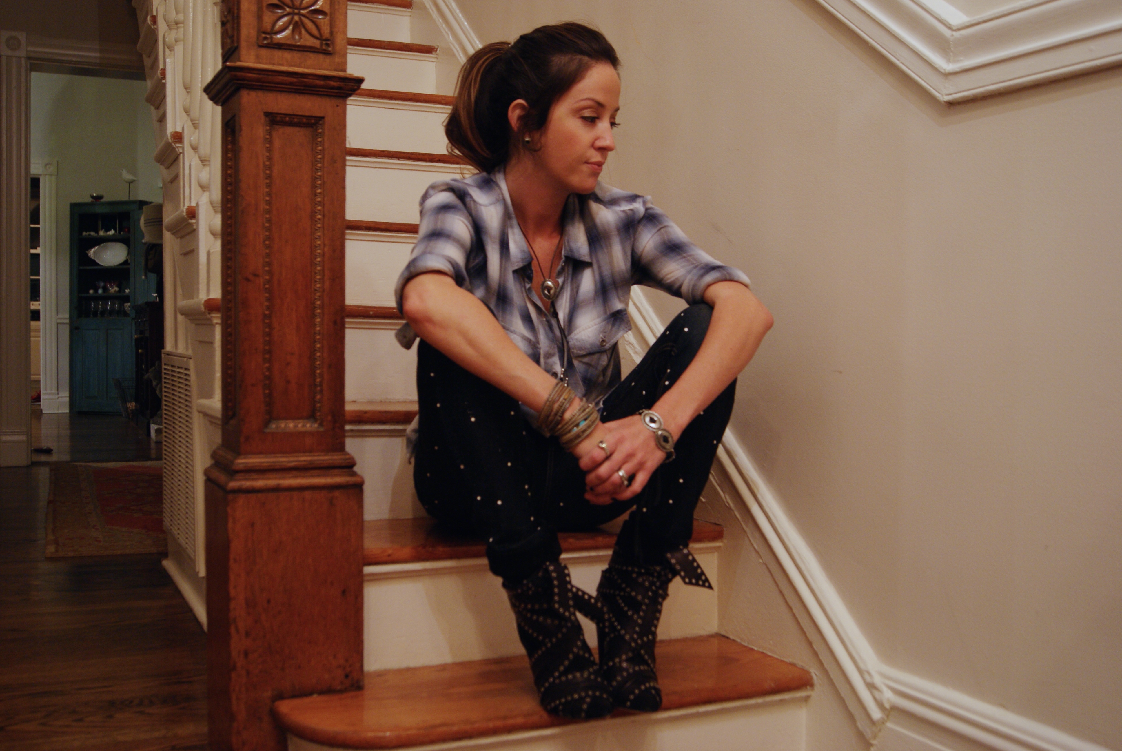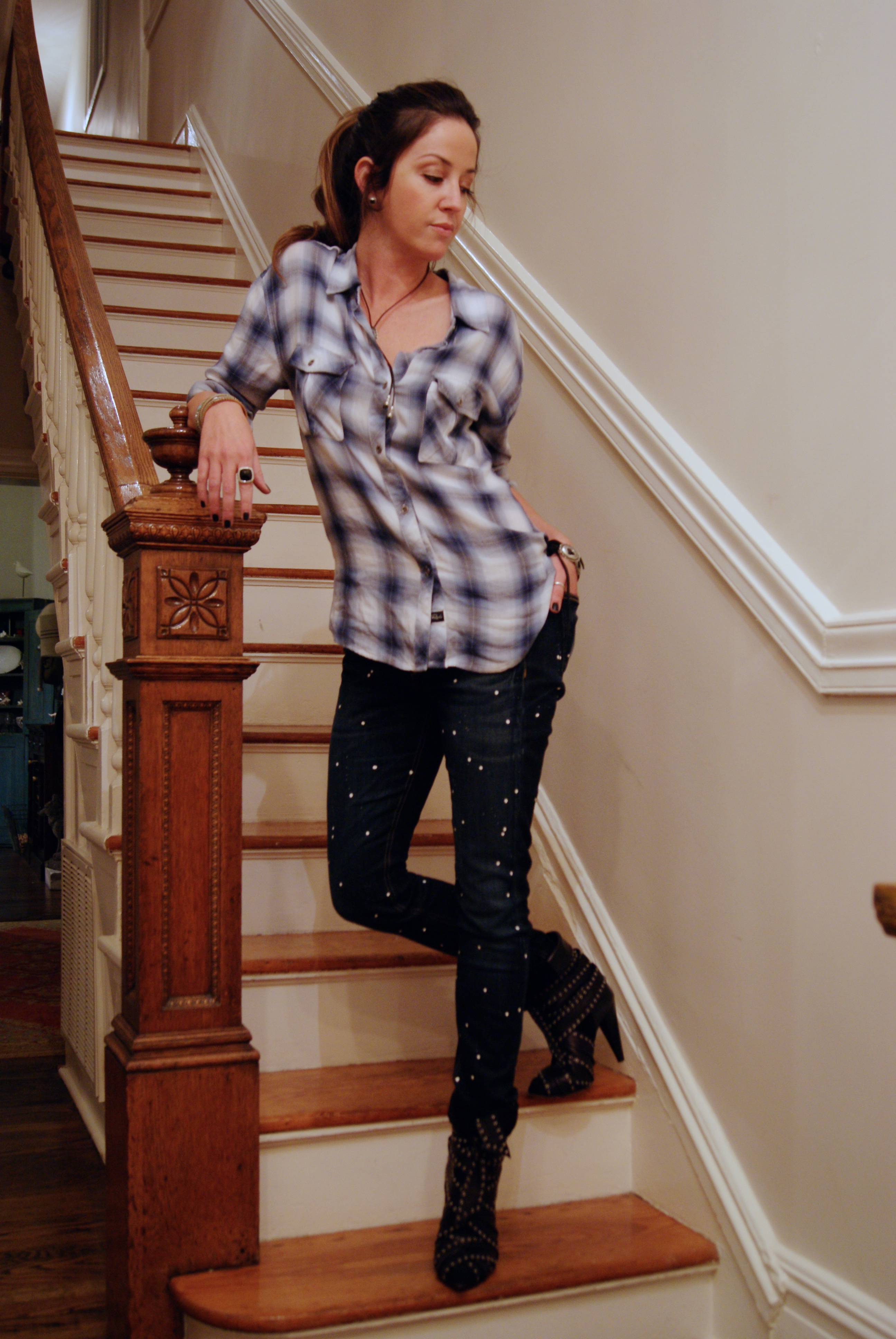 [deets for the cheap seats: Rag & Bone splatter jeans (finally found non-muff top jeans that fit!) + RAILS LA shirt + Vanessa Mooney necklace and bracelet + Isabel Marant booties on sale, with the money I made writing someone a website on the side—woo.]