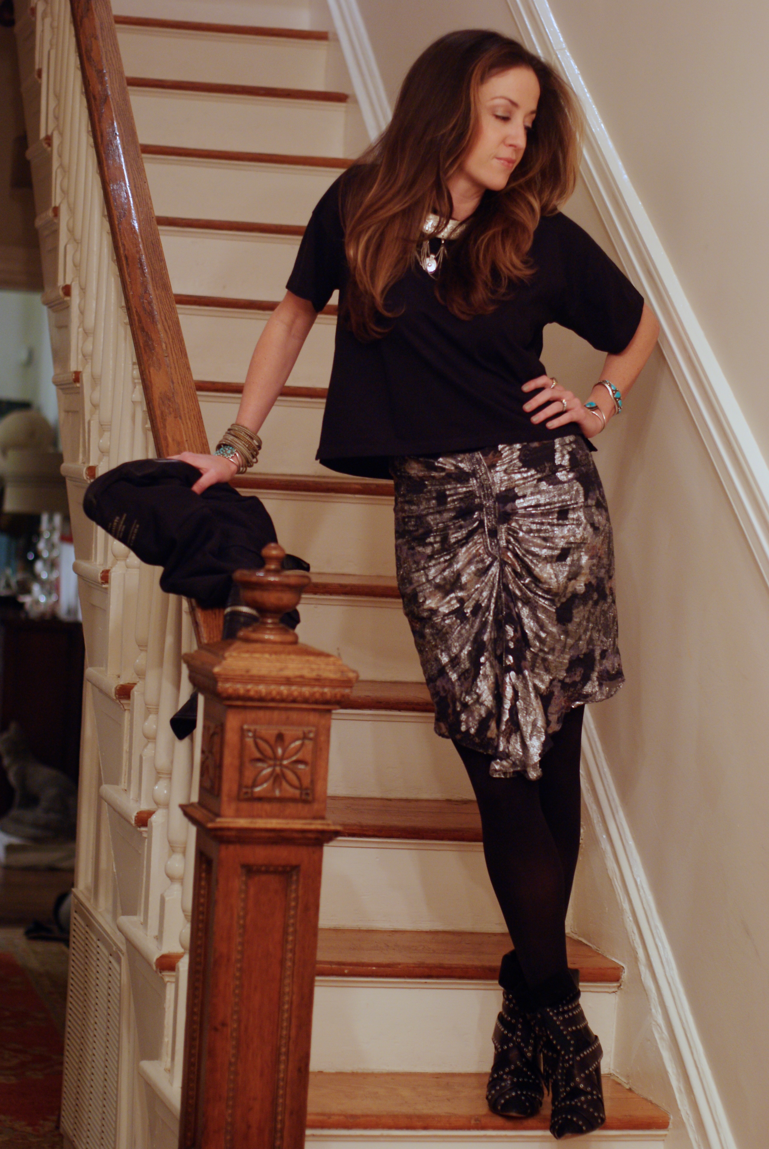 [Deets for the cheap seats: Madewell cropped t-shirt, the best shirt I’ve bought in years + Isabel Marant booties and skirt + All Saints jacket + Vanessa Mooney collar.]