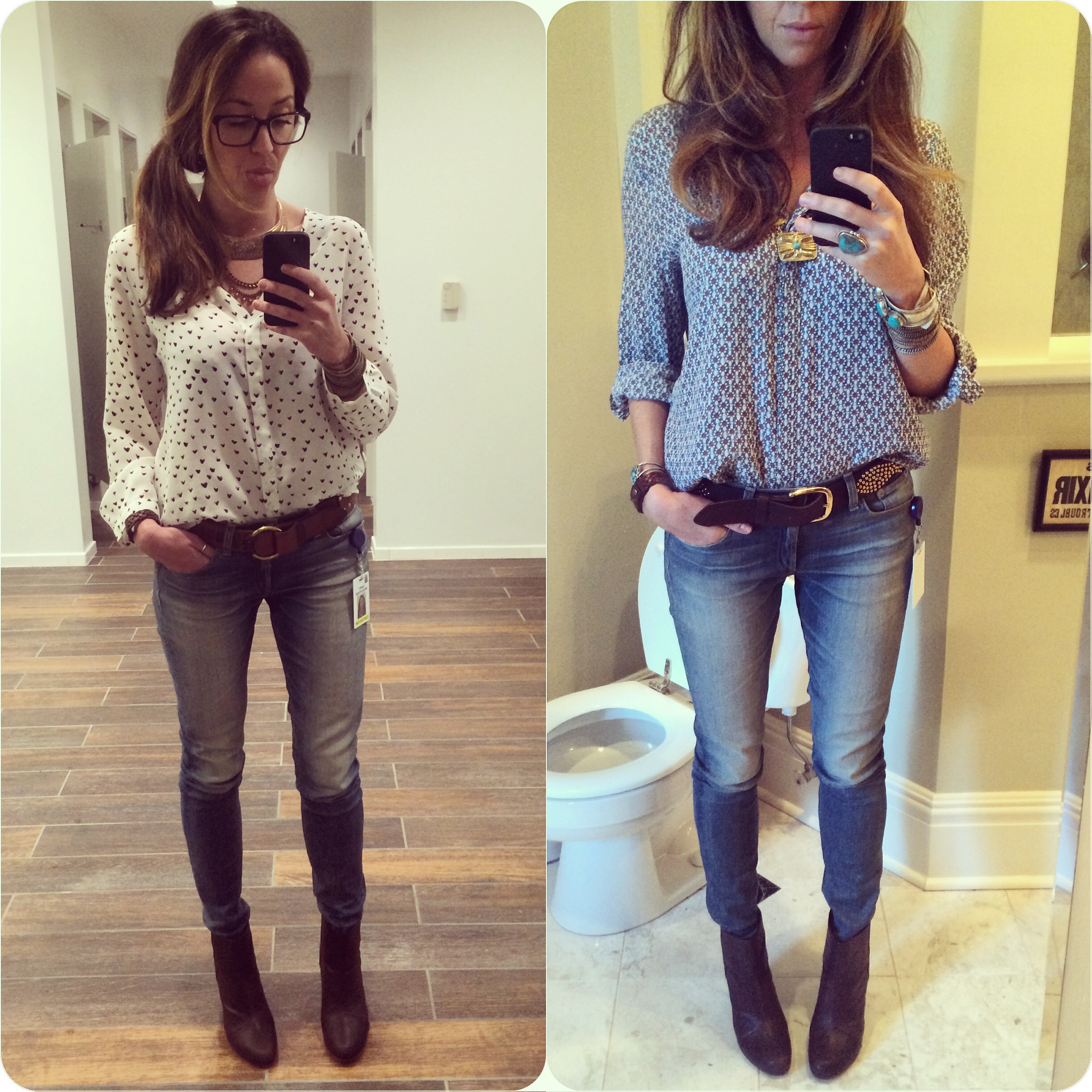 [Deets for the cheap seats: Rag & Bone Skinny jeans in Surf and Newbury booties + Joie blouses x2 + Vanessa Mooney necklaces x2 + B-Low the Belt belts x2.]