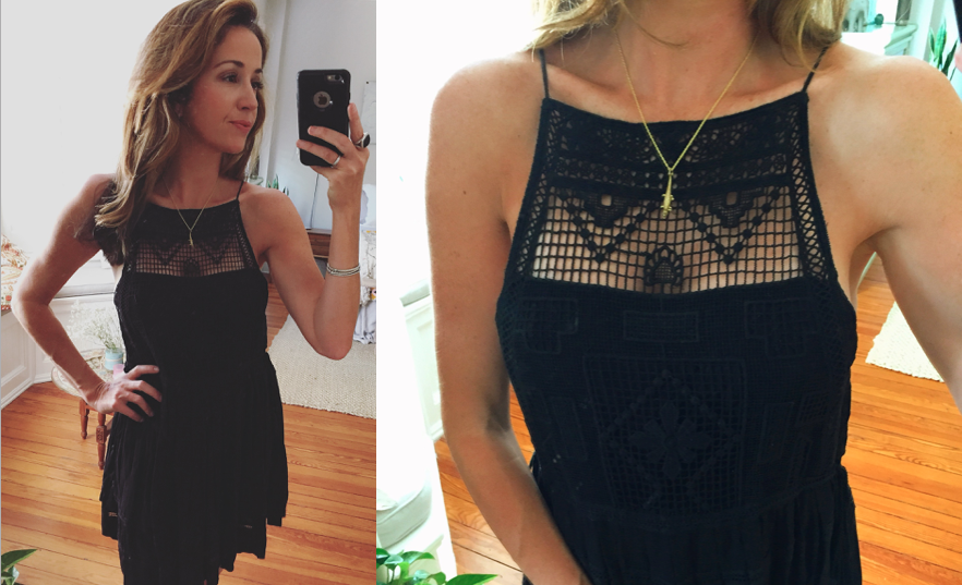 [Free People black cotton gauze dress + Vera Meat alligator pendant necklace.]