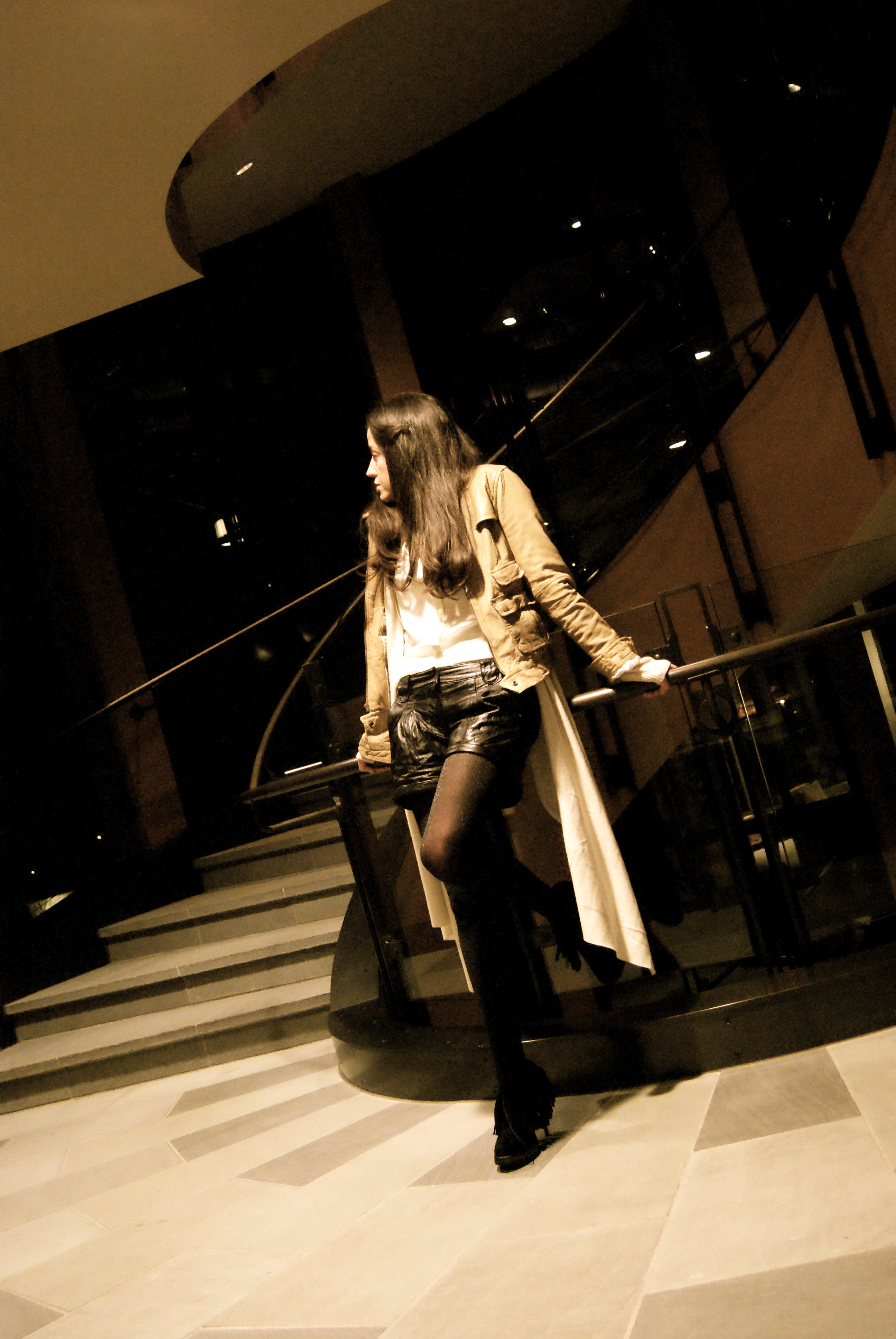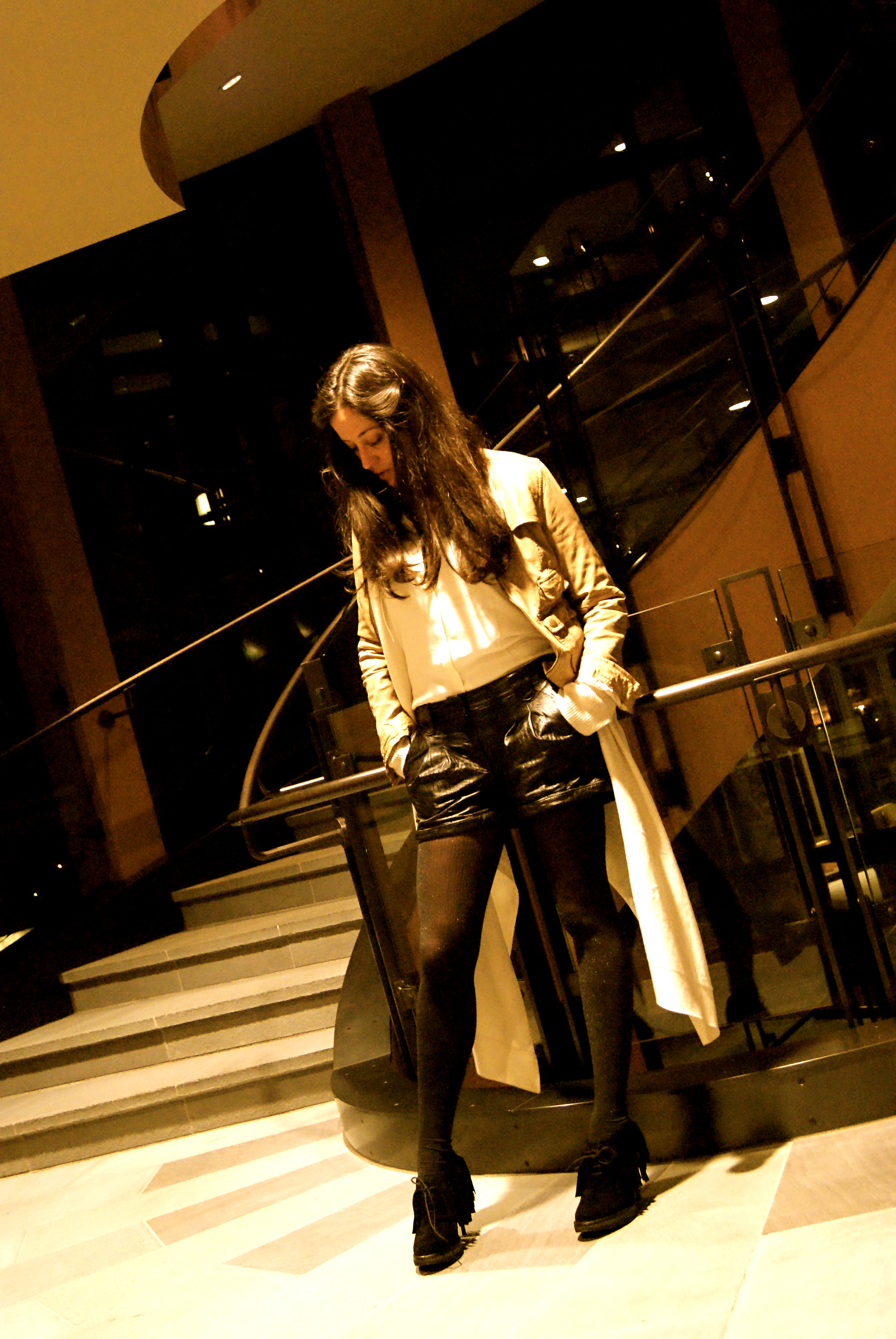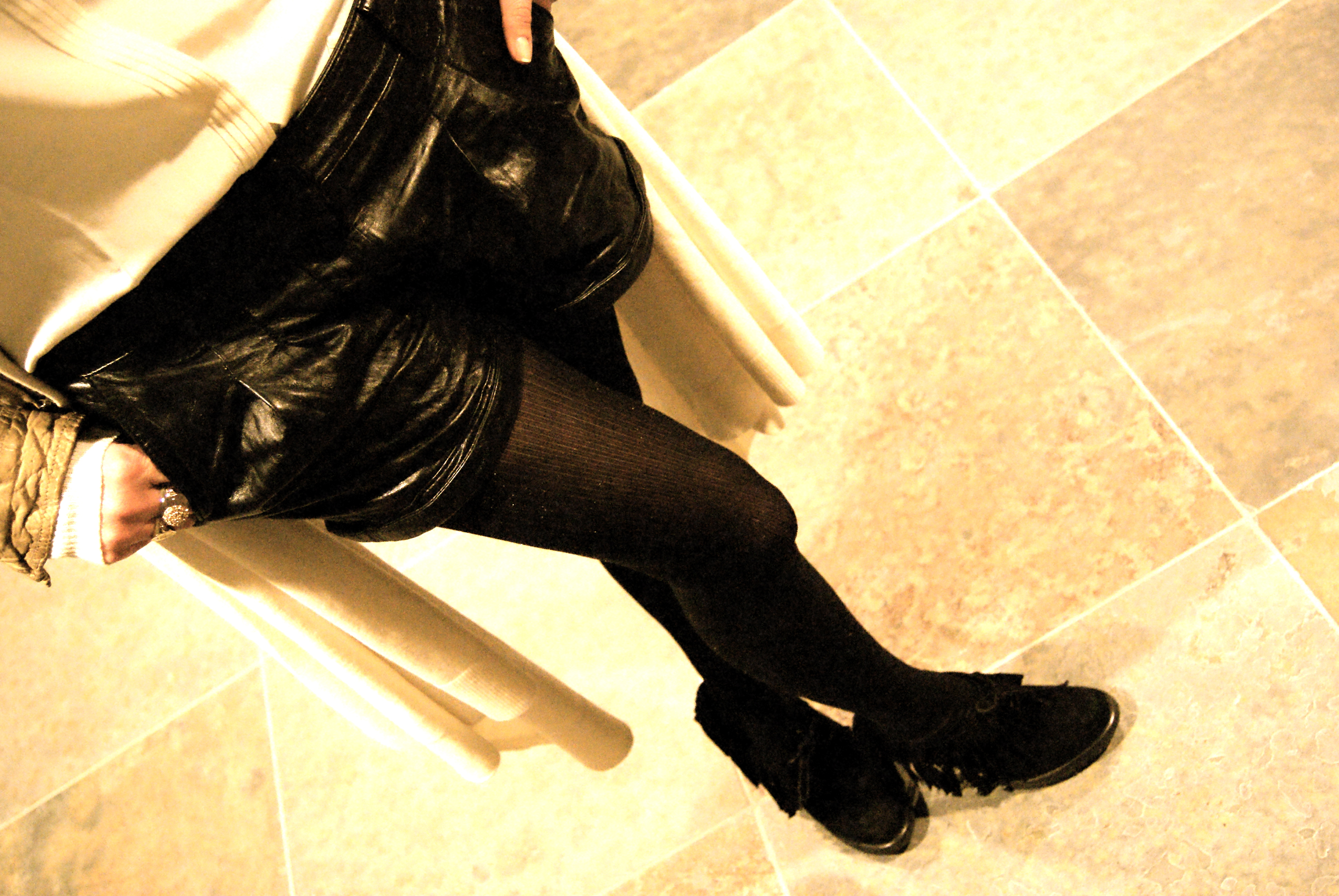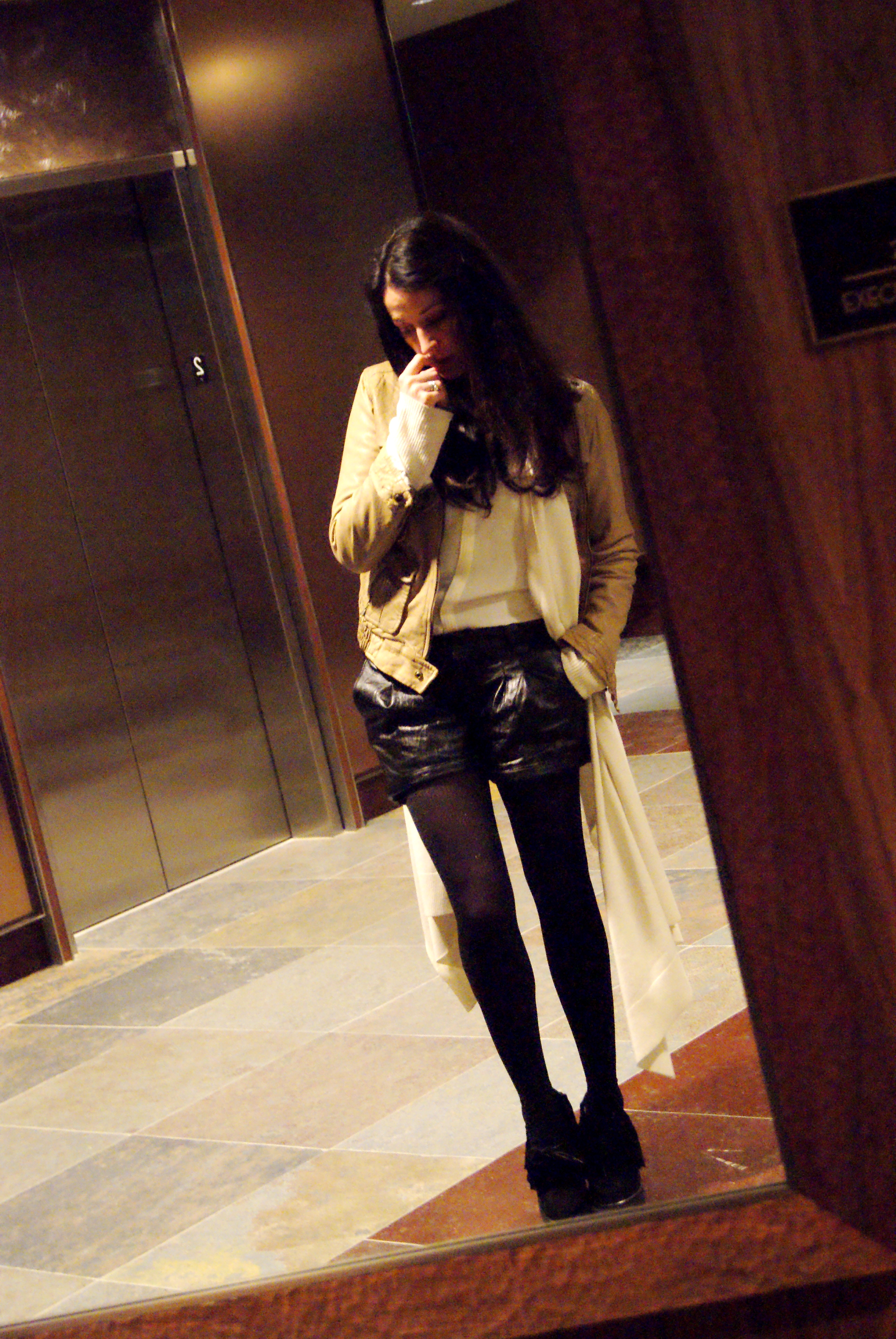 [Mike and Chris leather shorts + J.Crew silk blouse + Banana Republic leather jacket + DKNY Cozy wrap + J.Crew sparkle tights + Paul & Joe Sister booties.]