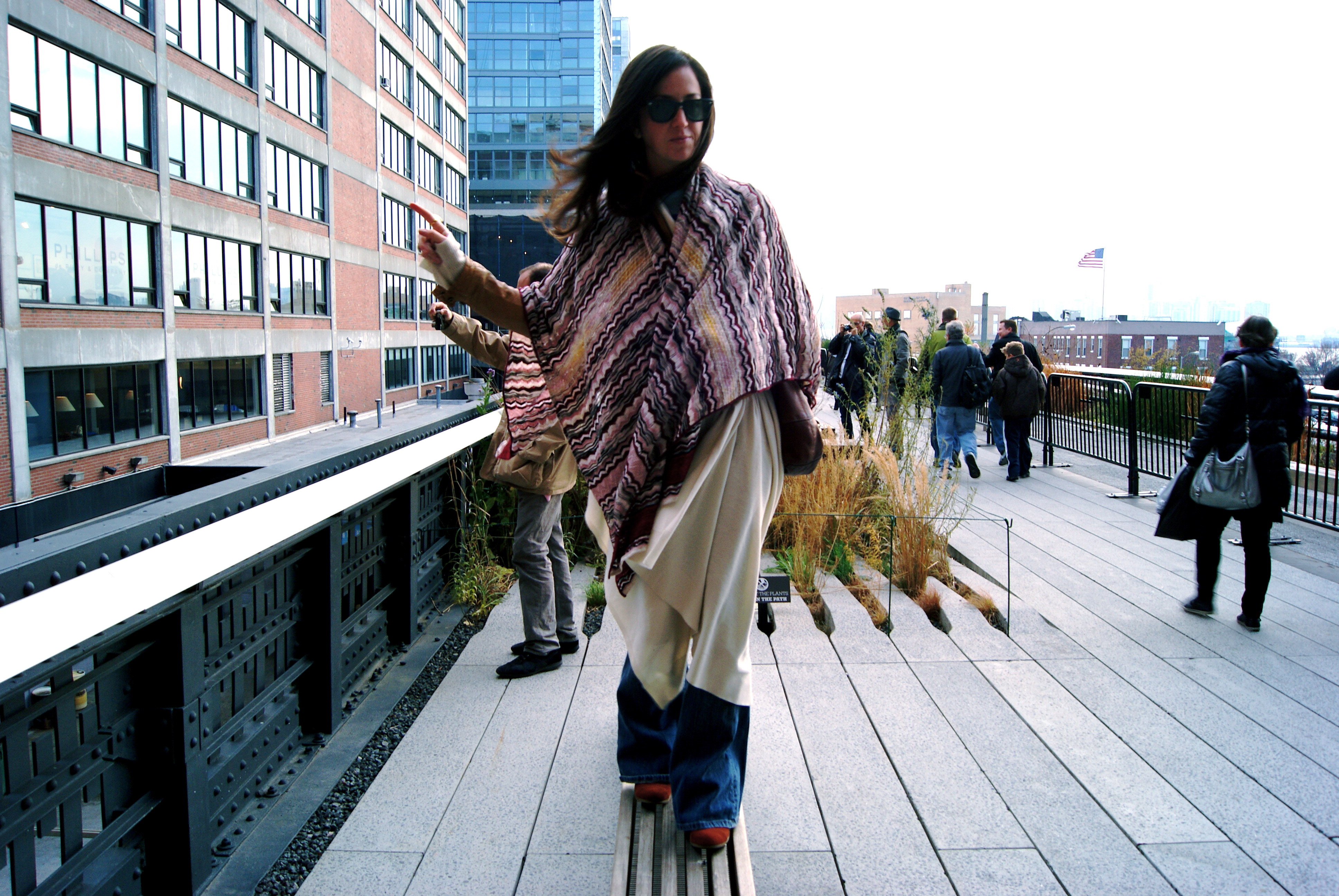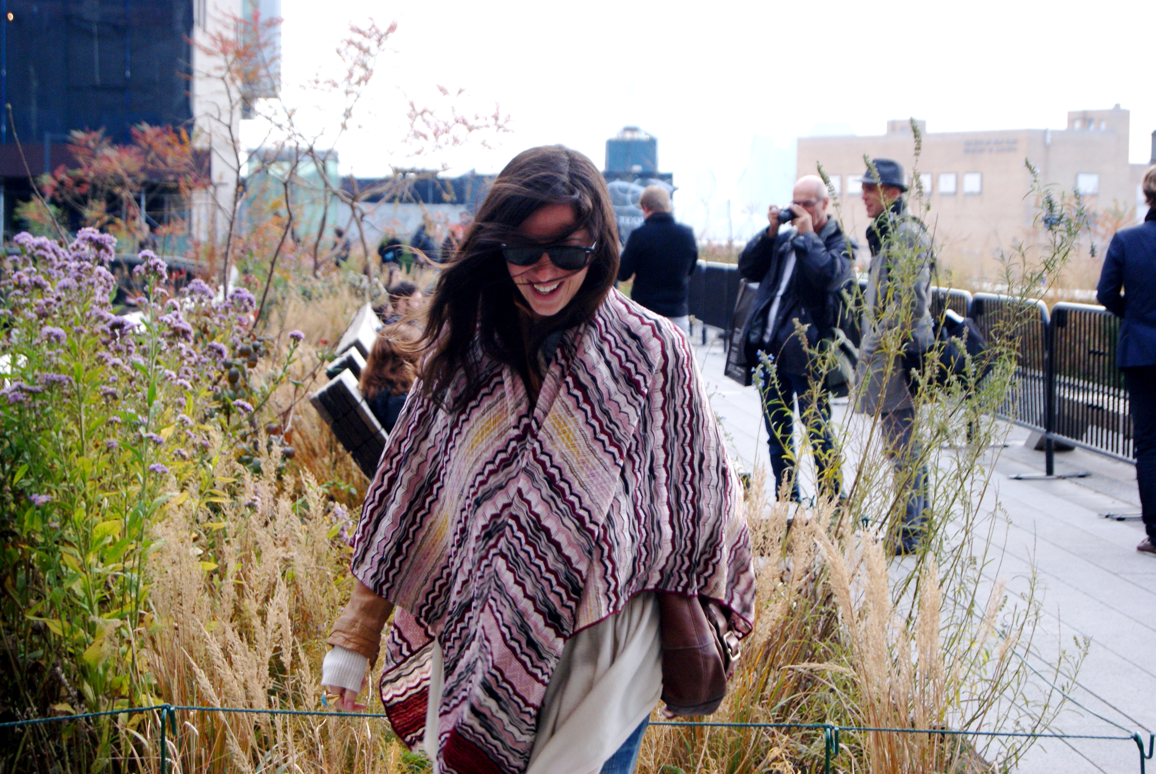 [Hanging on the High Line: Missoni shawl + DKNY sweater + Banana jacket + ASOS booties + Current/Elliott jeans = total bag lady.]