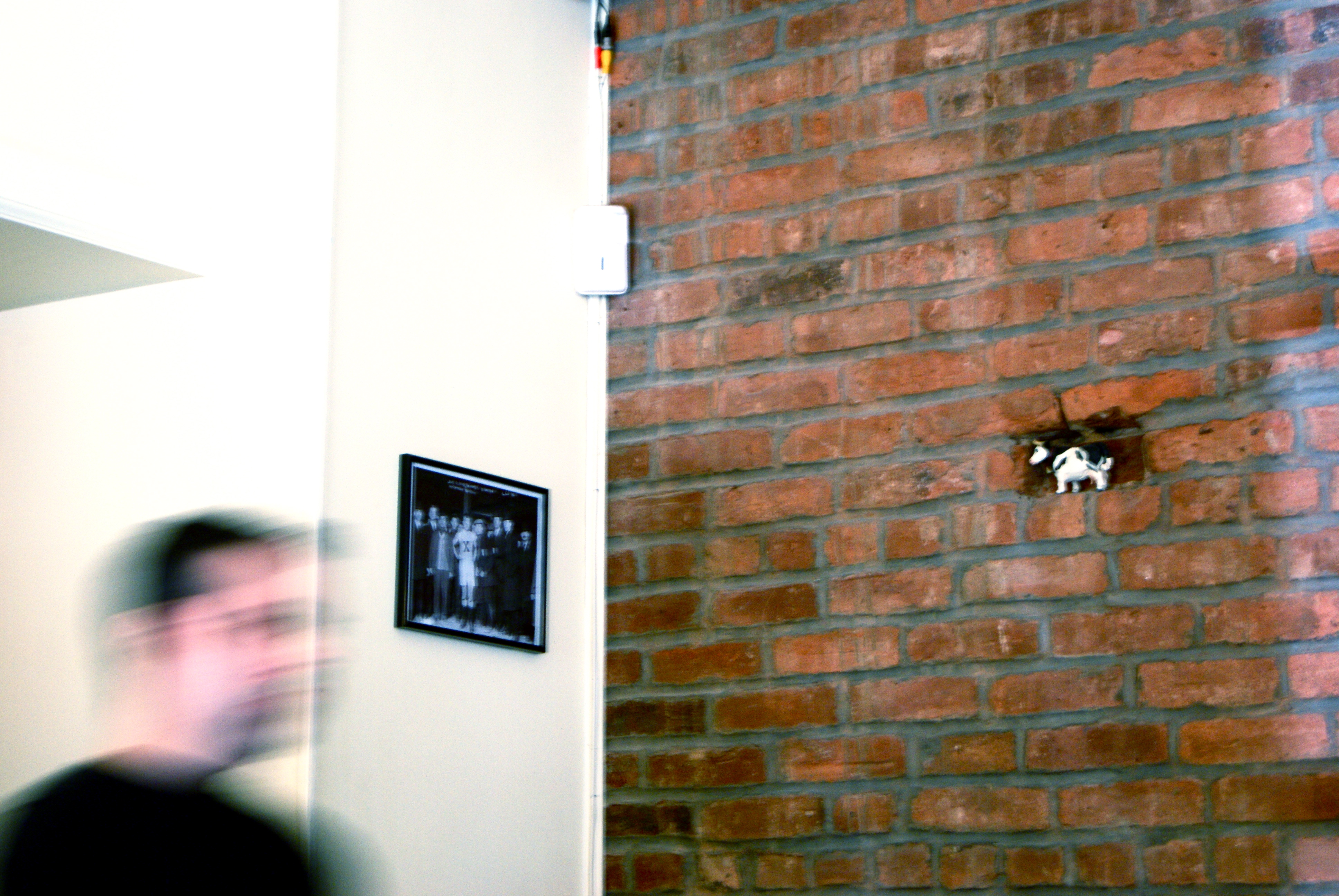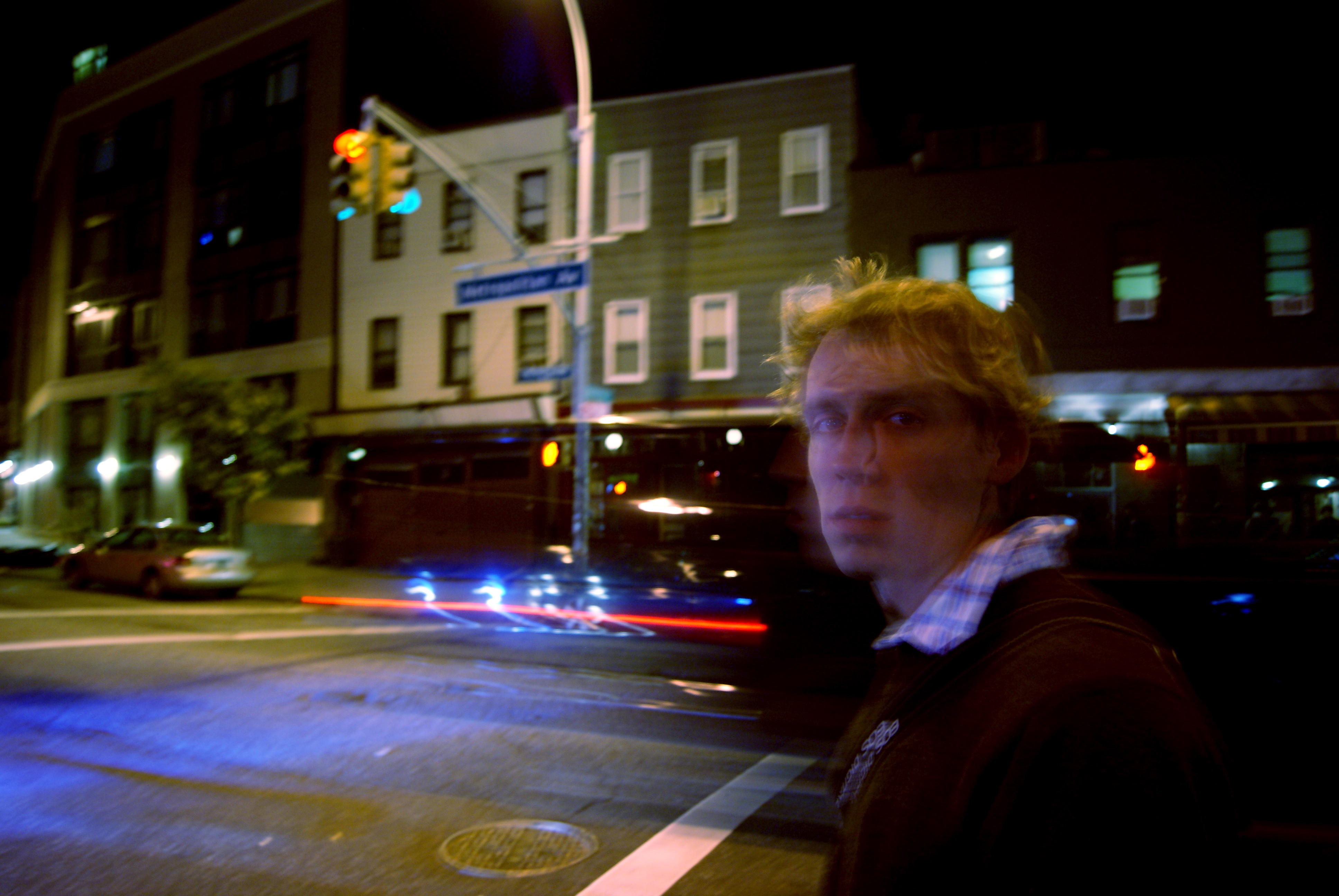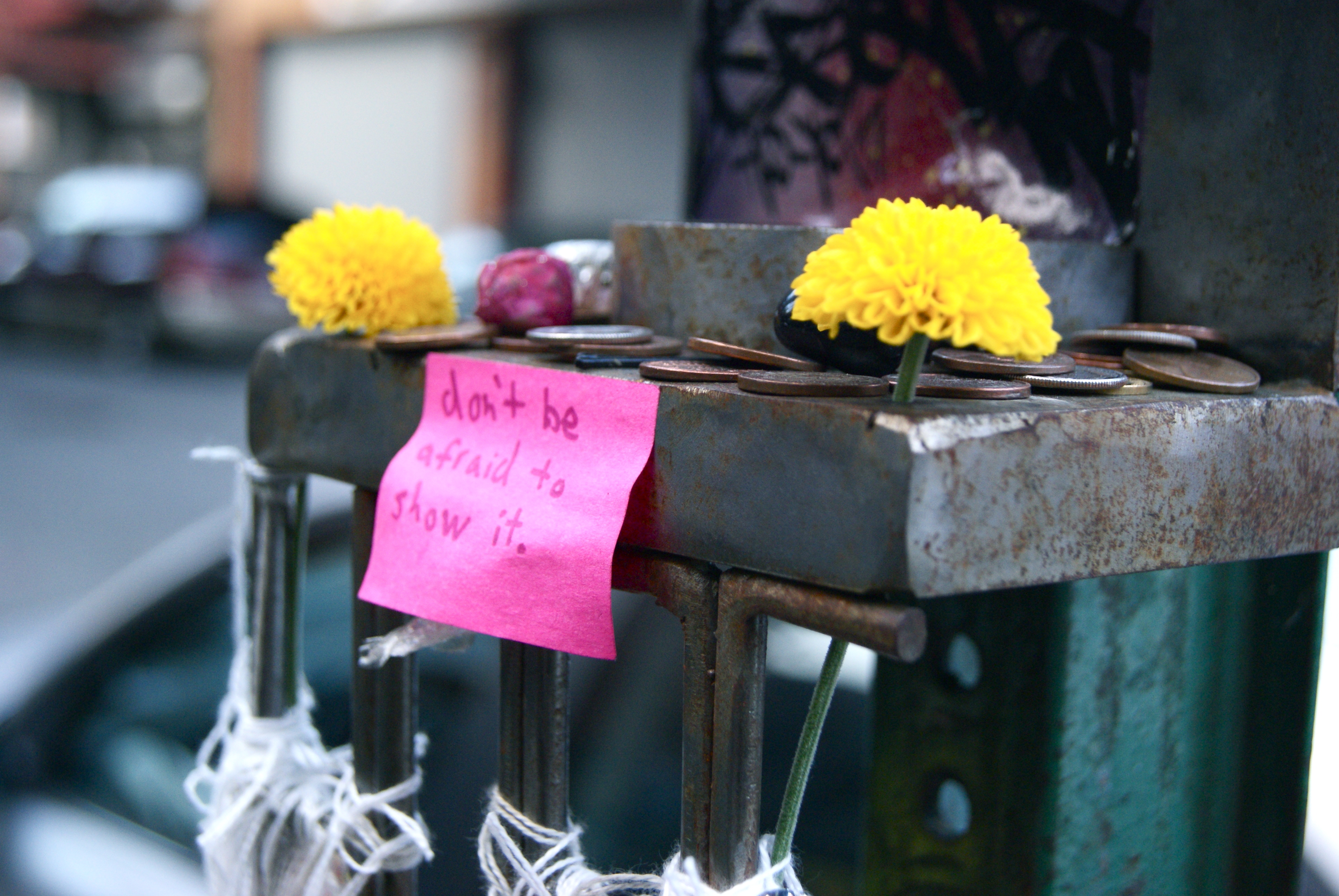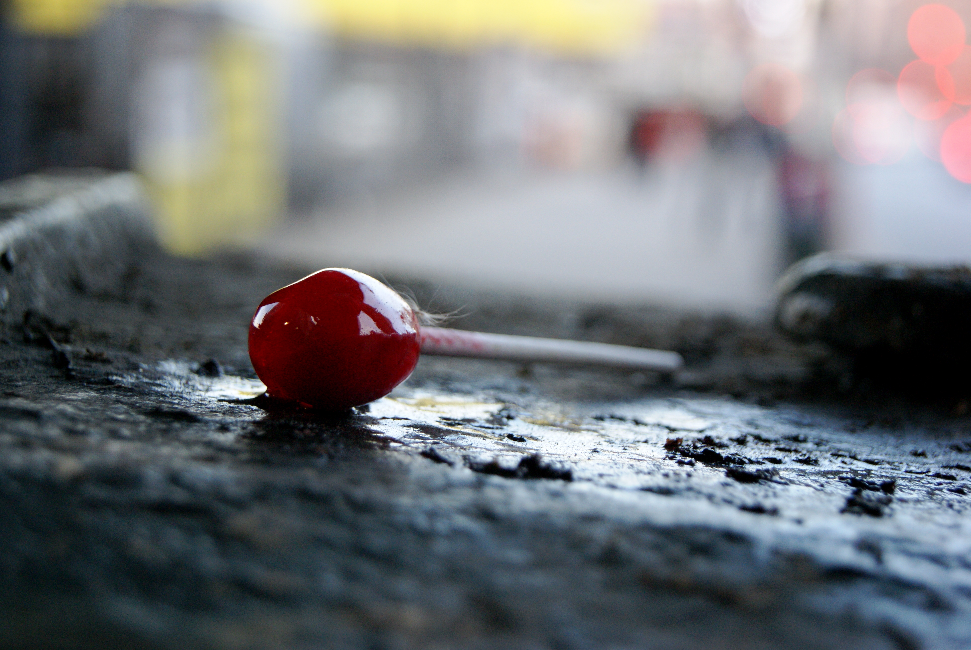 Best photo find of the weekend—one thoroughly sucked red lollipop with downy feather attached. The traffic light box is receiving a nice varnishing.