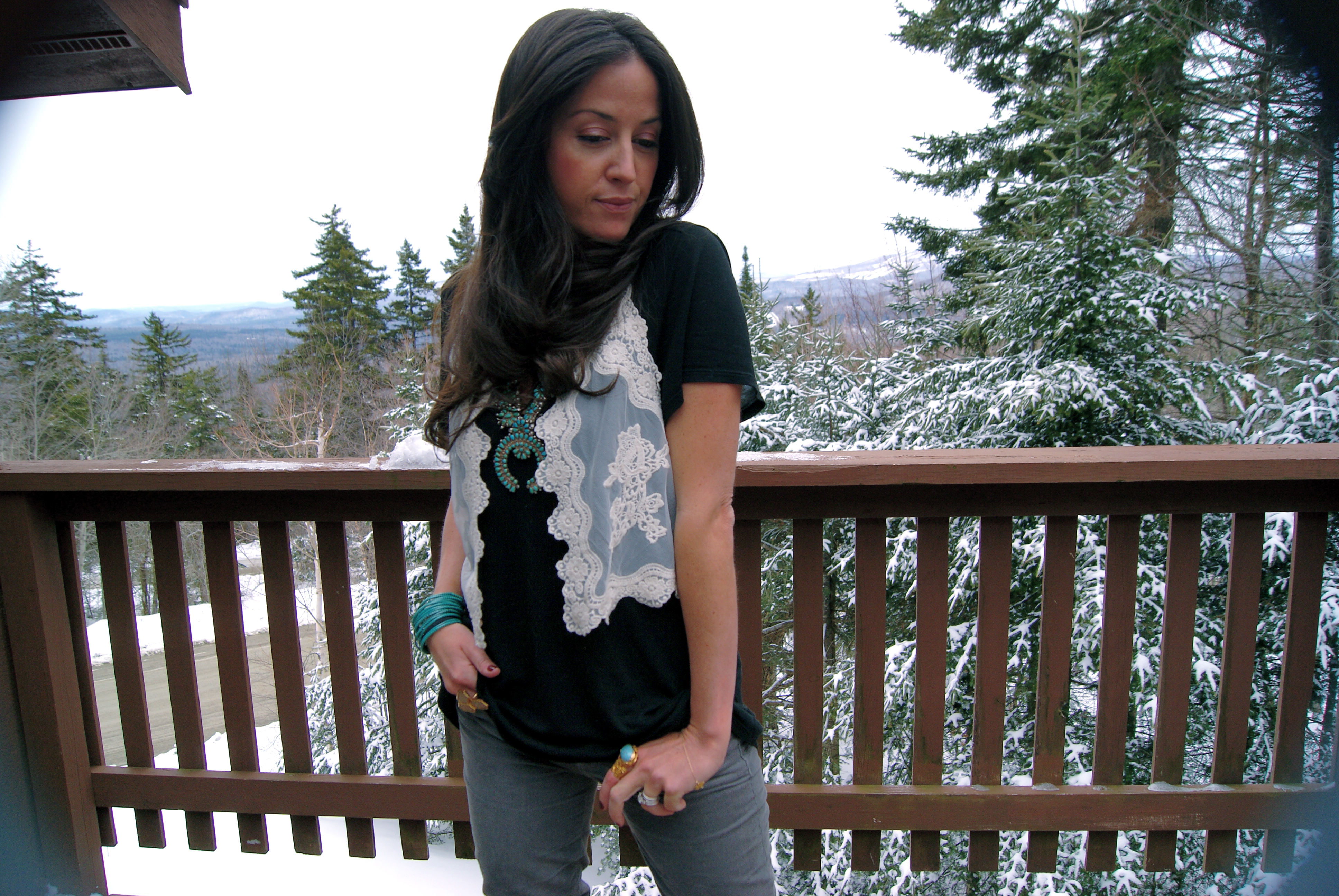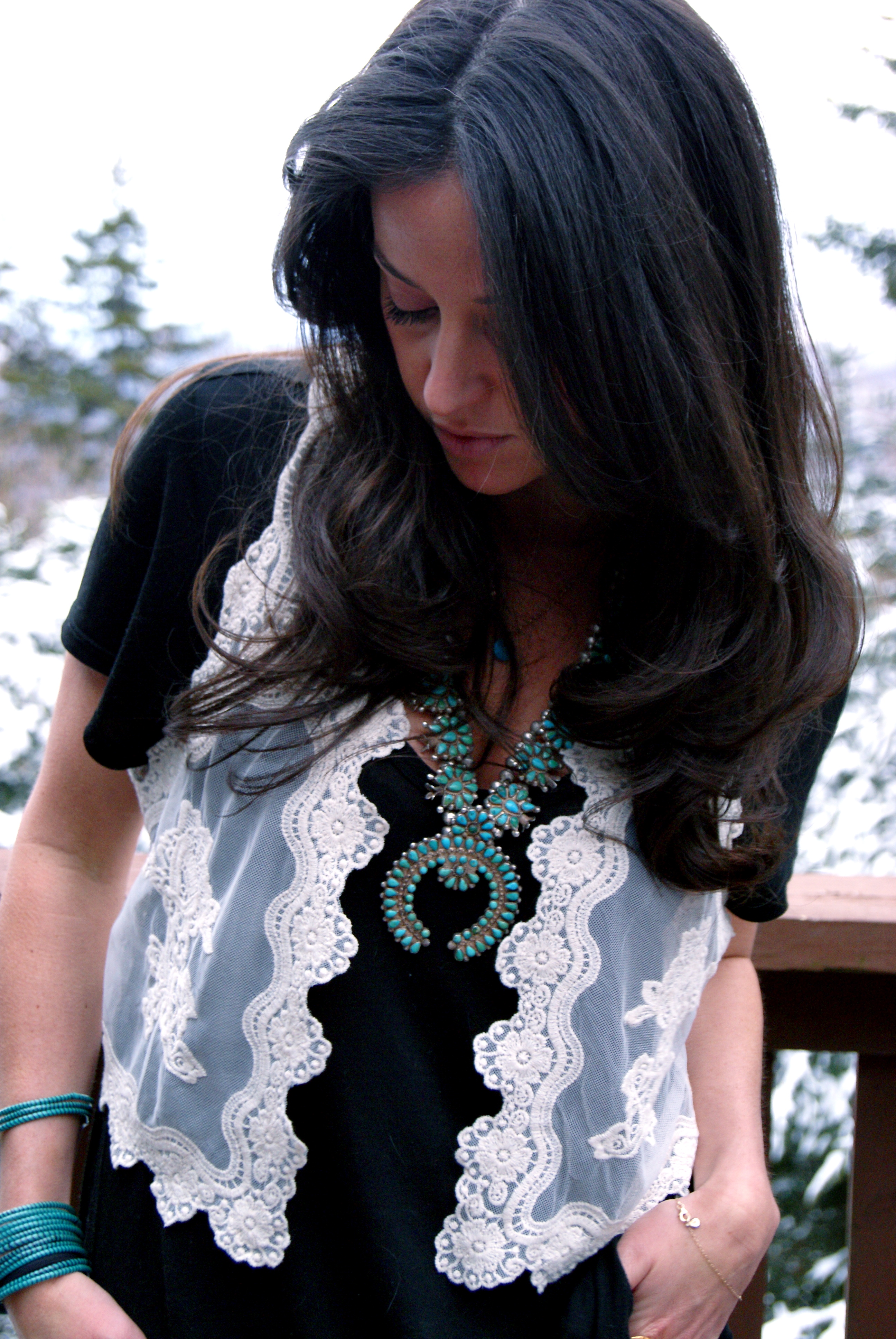 [H&M lace vest + squash blossom necklace + Made with Love bracelets + A Wang tee + J.Crew cords + Joie lace up boots + Gorjana bracelet and pendant.]