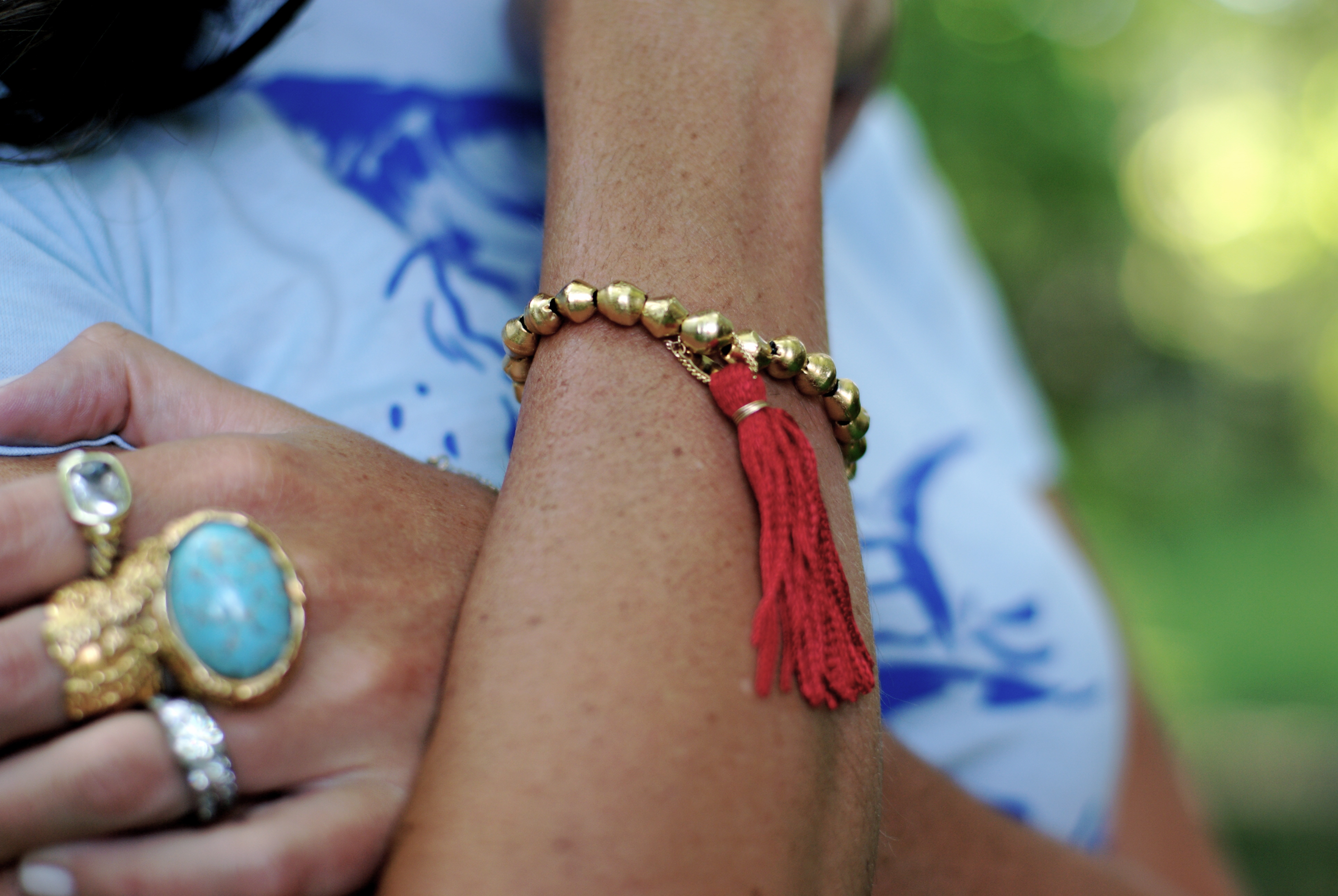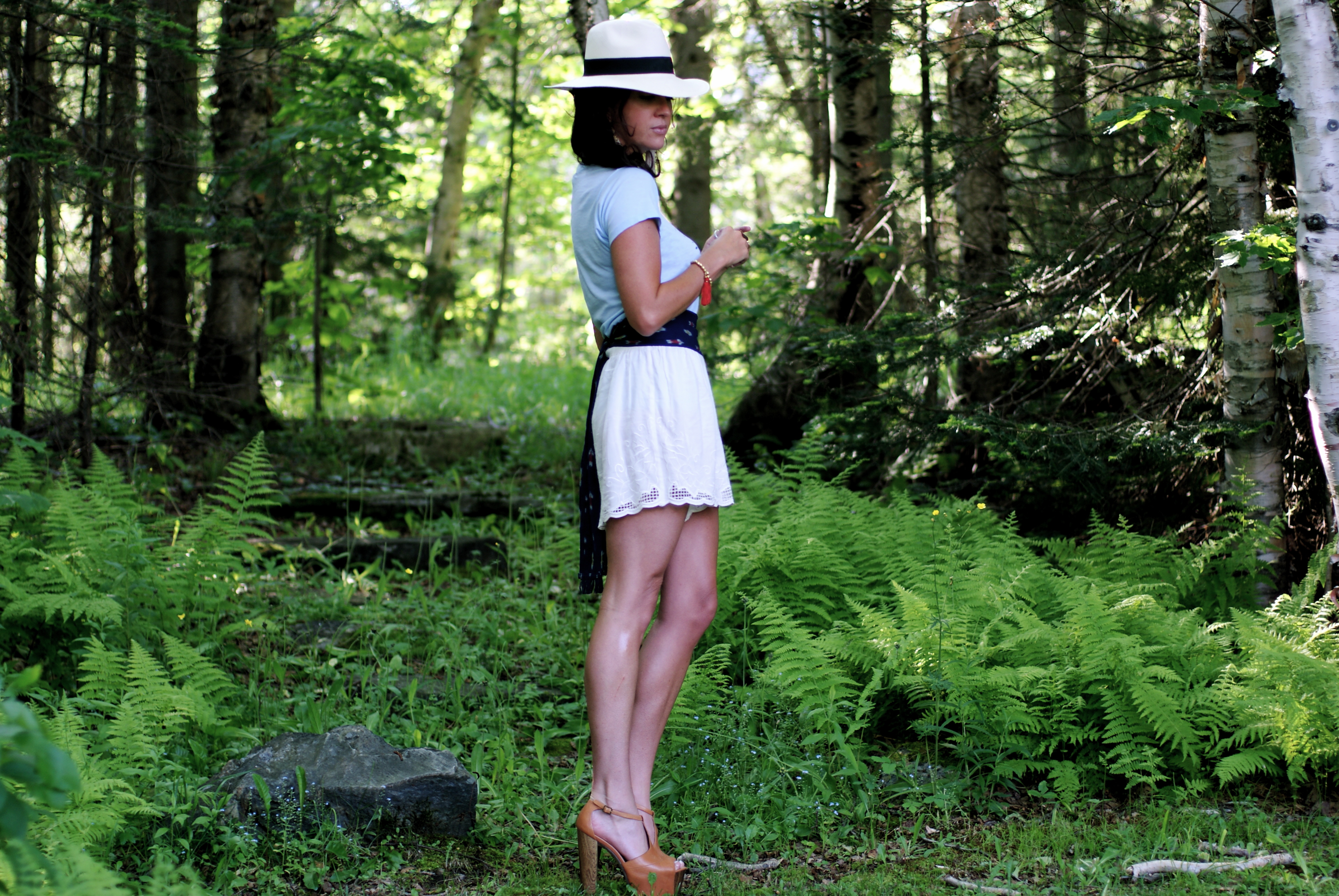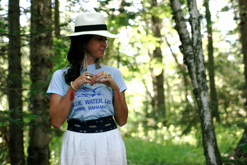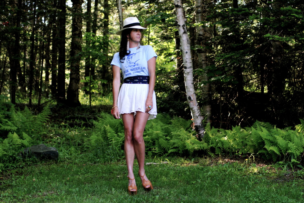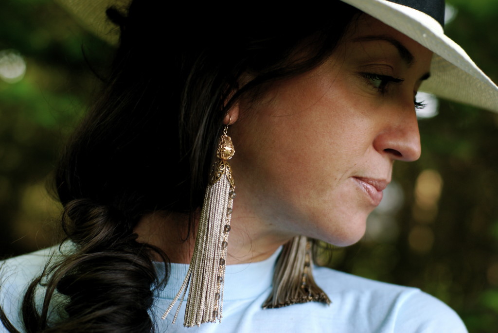[Citrine by the Stones tasseled bead bracelet + Citrine by the Stones Rosary Tassel earrings, both courtesy CBTS + Vintage t-shirt, Wodehouse family heirloom + Free People shorts via shopbop + J.Crew ikat belt + Jessica Simpson Dany platforms + J.Crew Panama hat + YSL, Erin Wasson, etc. rings.]