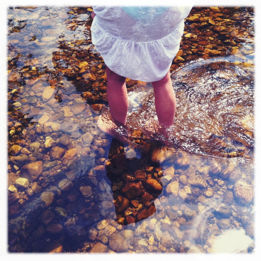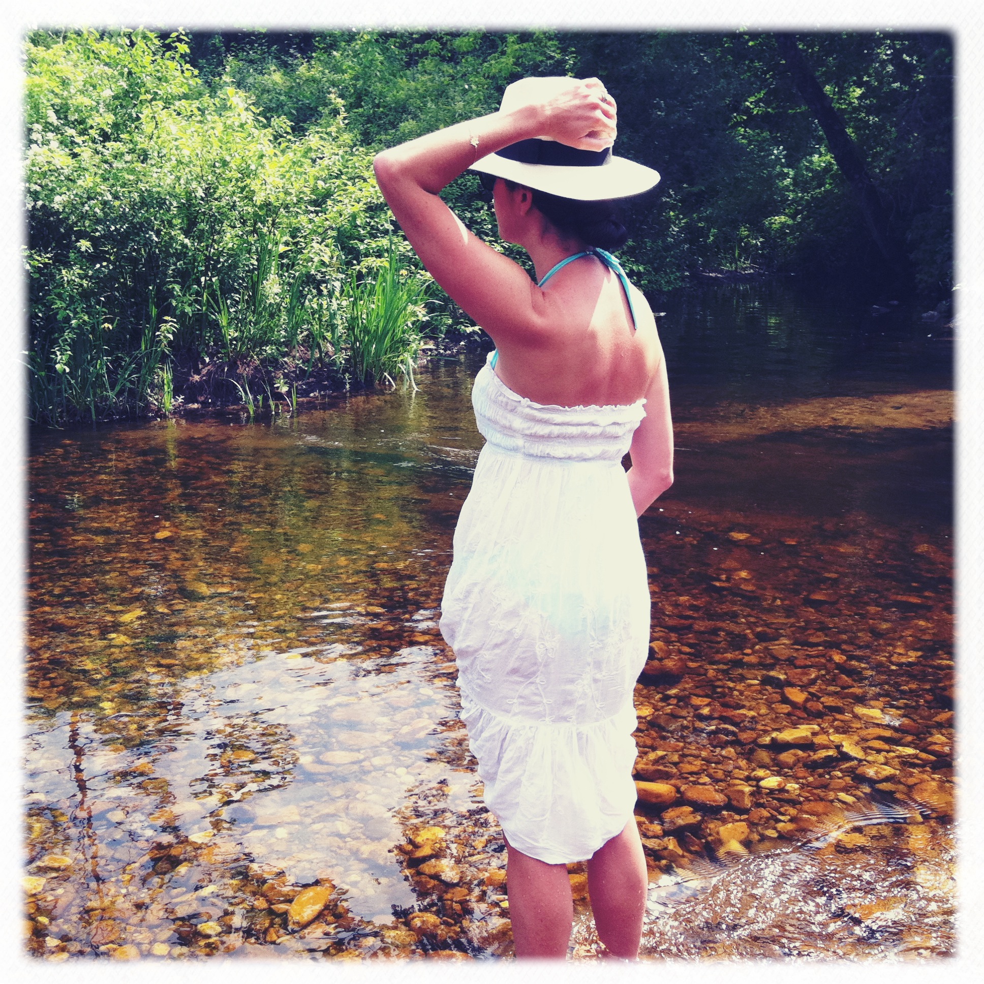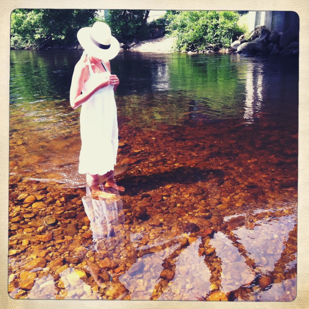 With some patience, I’d removed my dress and placed my hat on Rob’s head, wrapping my arms around my stomach for warmth and deerfly protection. I waded in slowly, swearing like a sailor when the water lapped at my belly button.