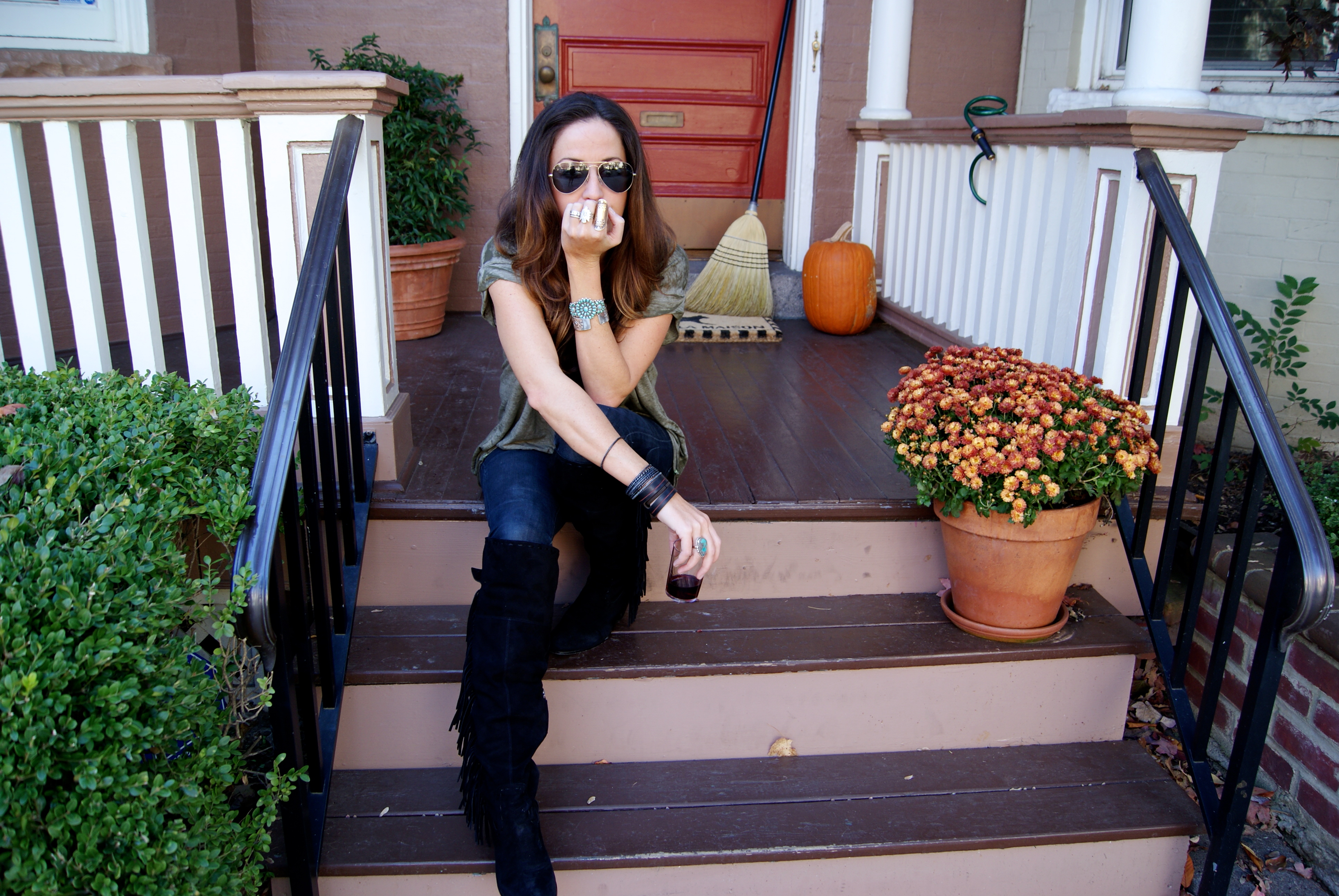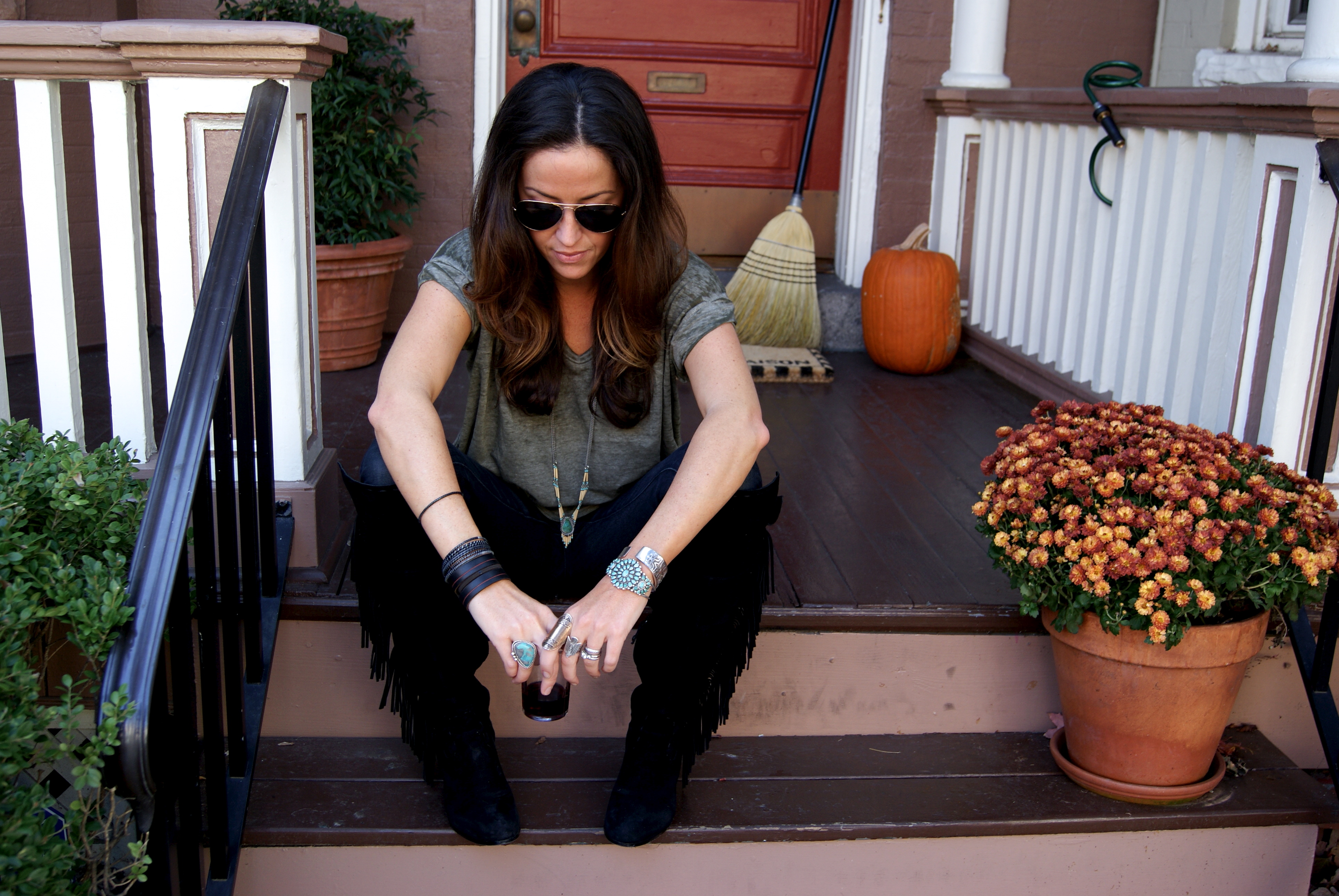 [AG Legging jean + Sam Edelman Luella OTK fringed boots + Free People Keep Me tee, maybe the best thing ever stitched and sewn on earth + Vanessa Mooney Eeva Necklace + Made with Love bracelets, vintage turquoise, Billy Kirk cuff, etc.]