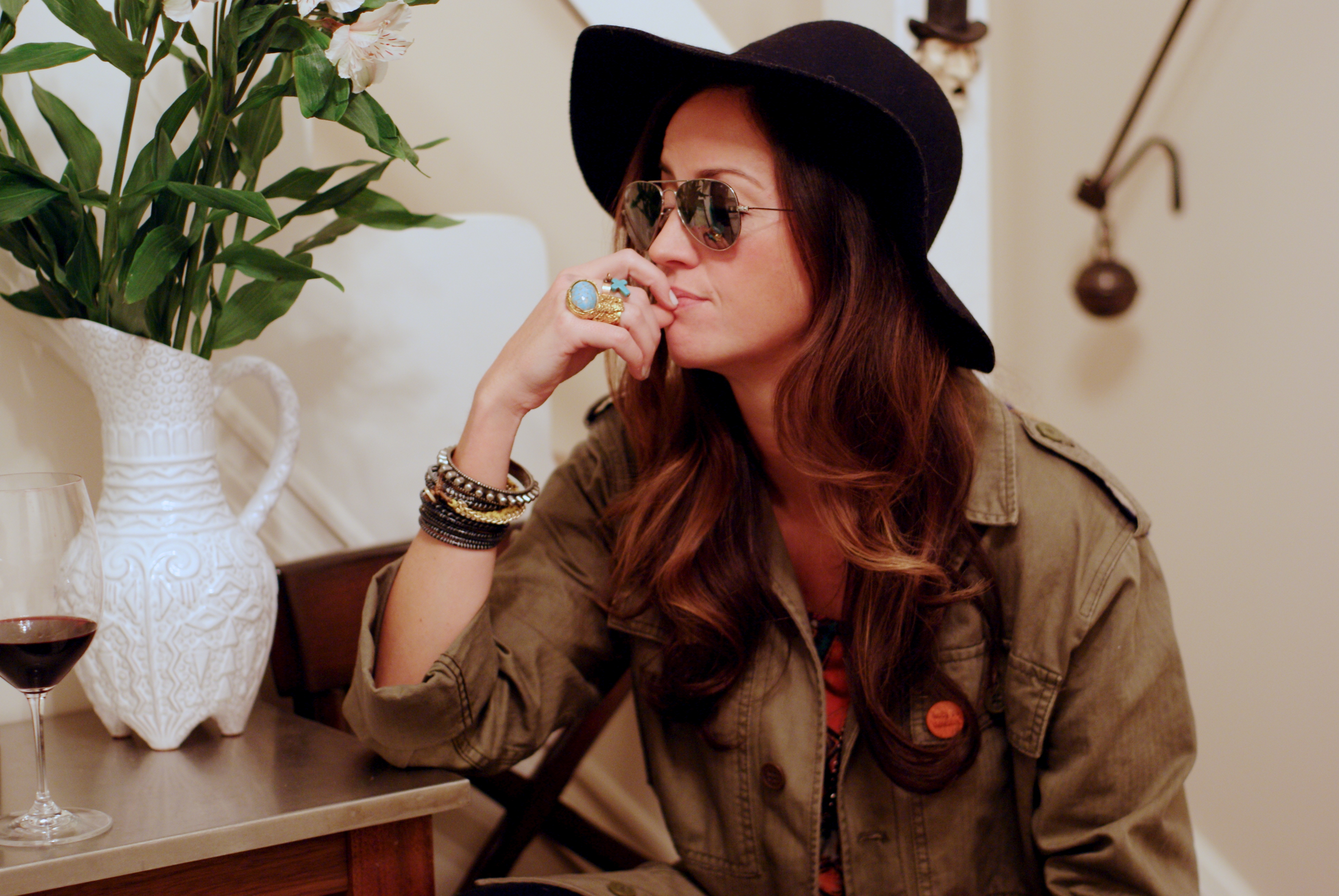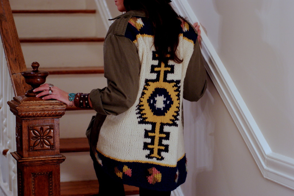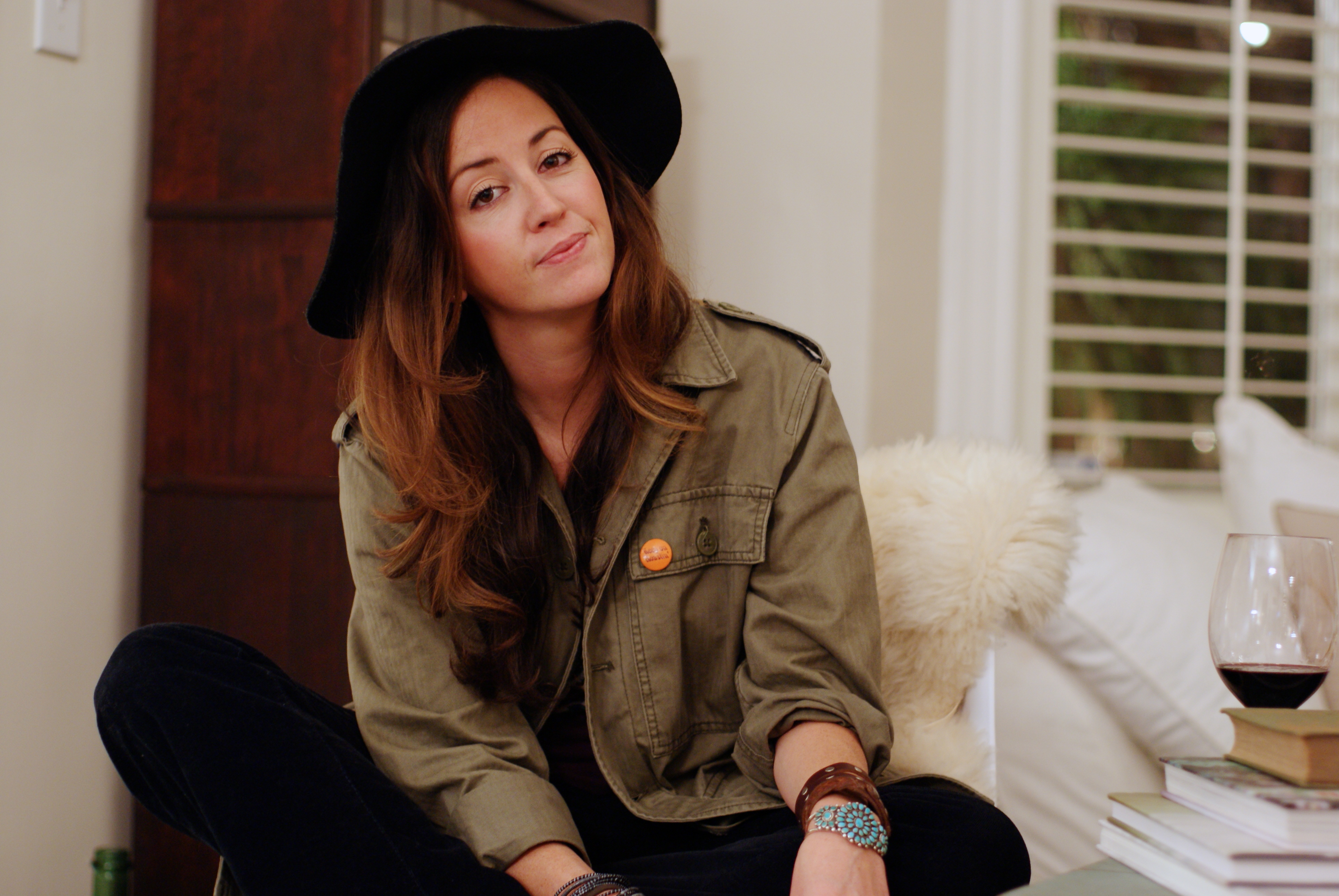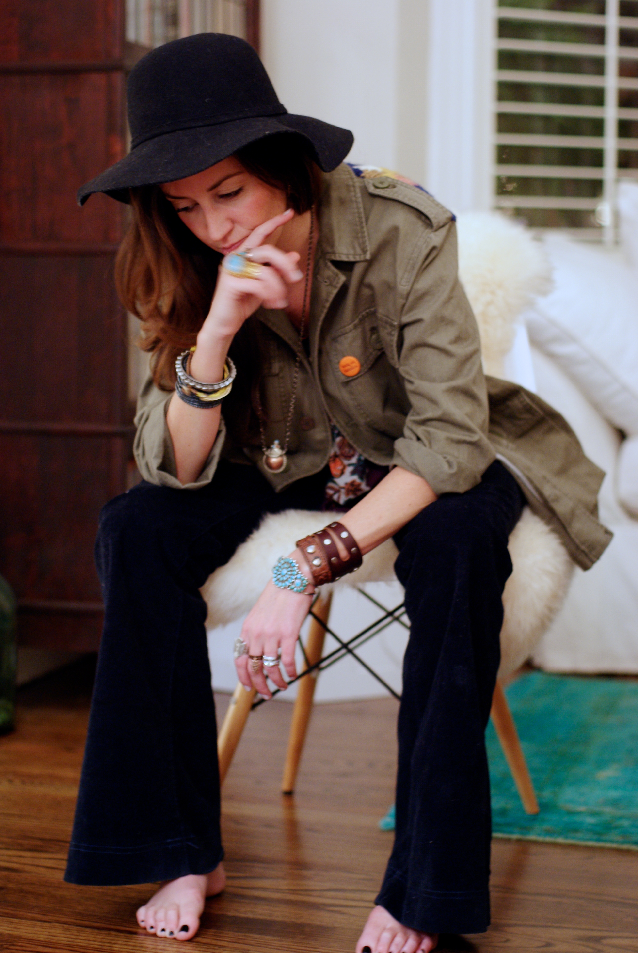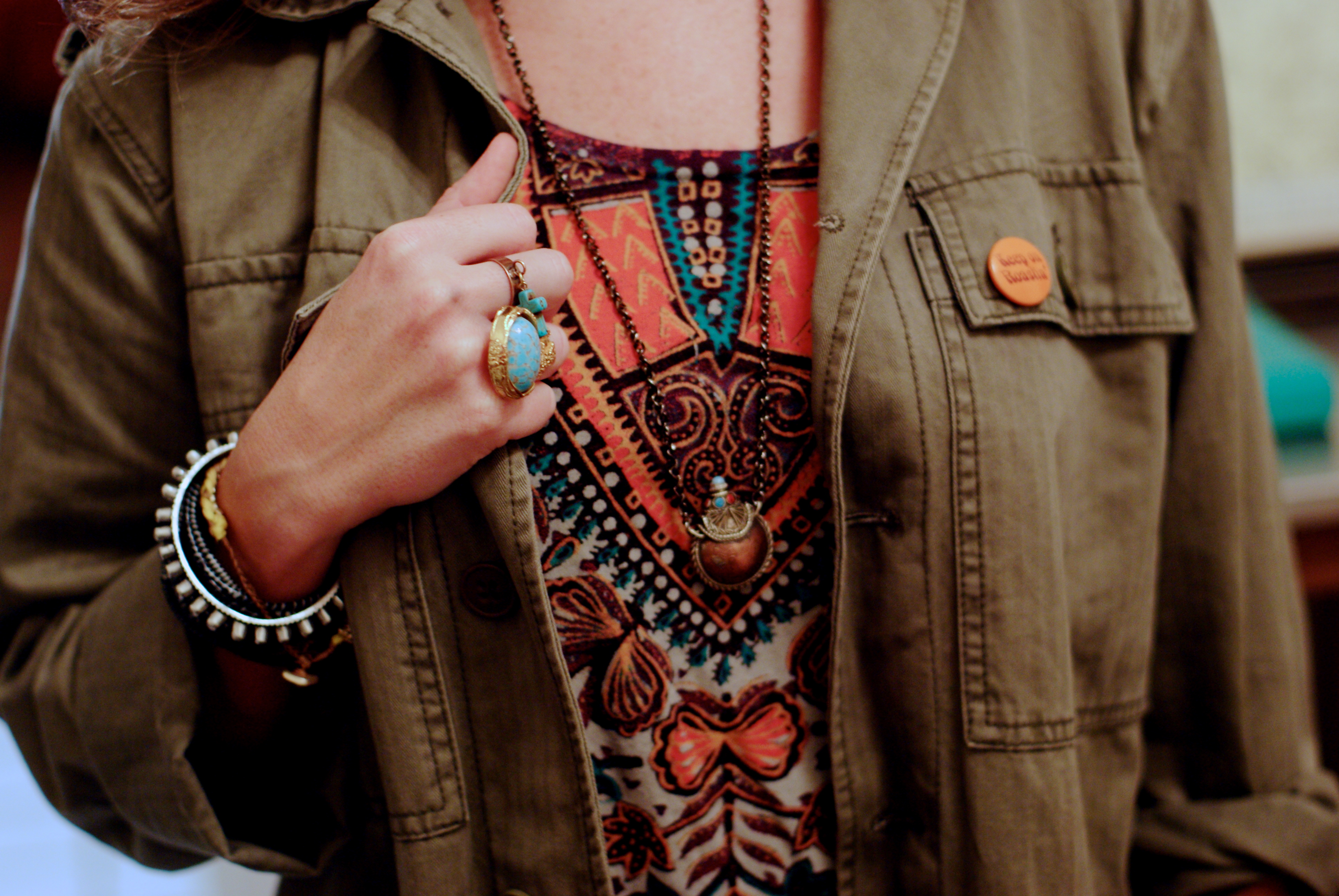 [Daughters of the Liberation army jacket + vintage pins + Vanessa Mooney pendant + Deena & Ozzy hat + Title Unknown dashiki t + some bellbottom cords don’t remembah.]
