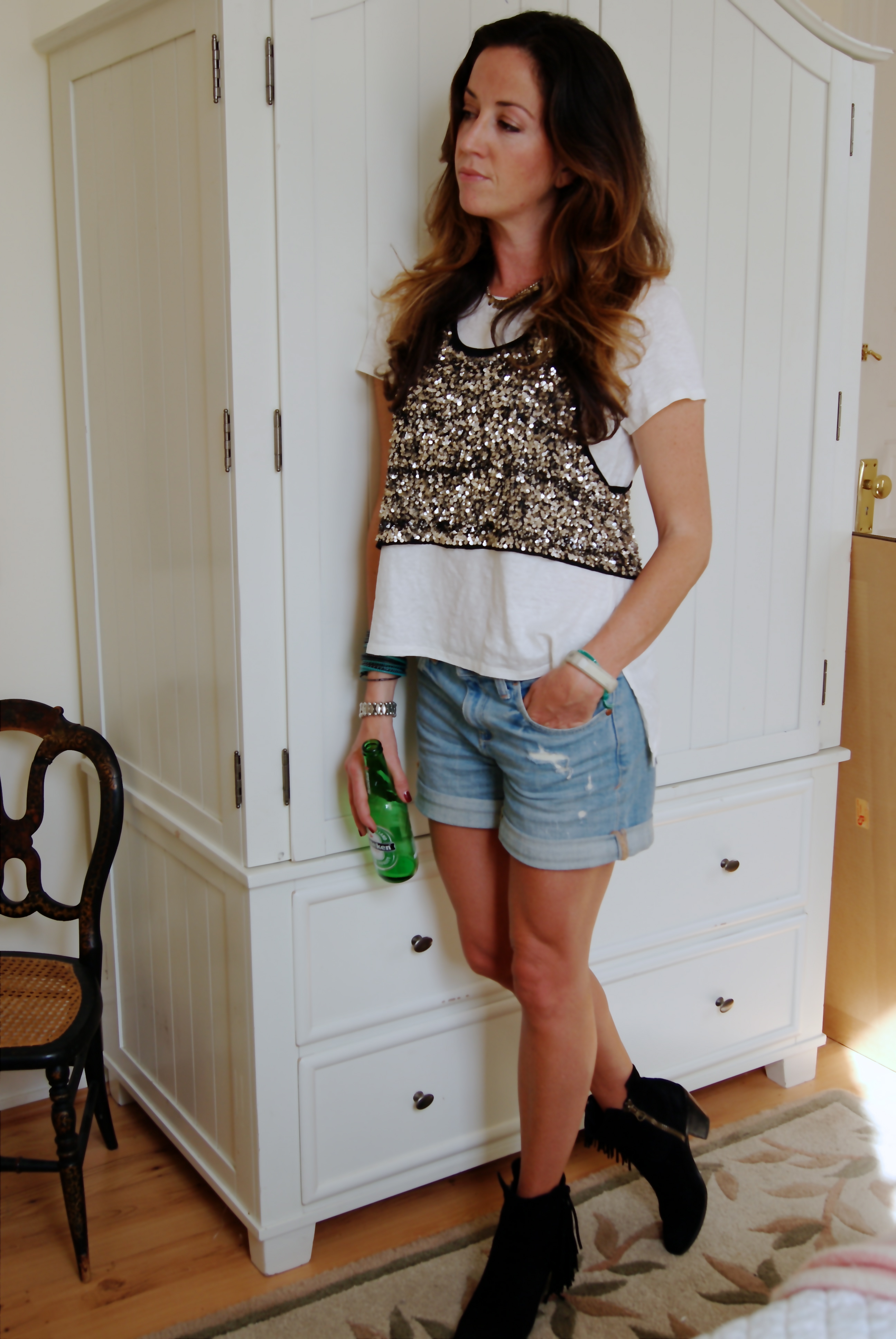 [Gryphon NY sequined vest w/ t-shirt via Shobop + Pilcro roll ups + Sam Edelman Louie boots + Vanessa Mooney.]