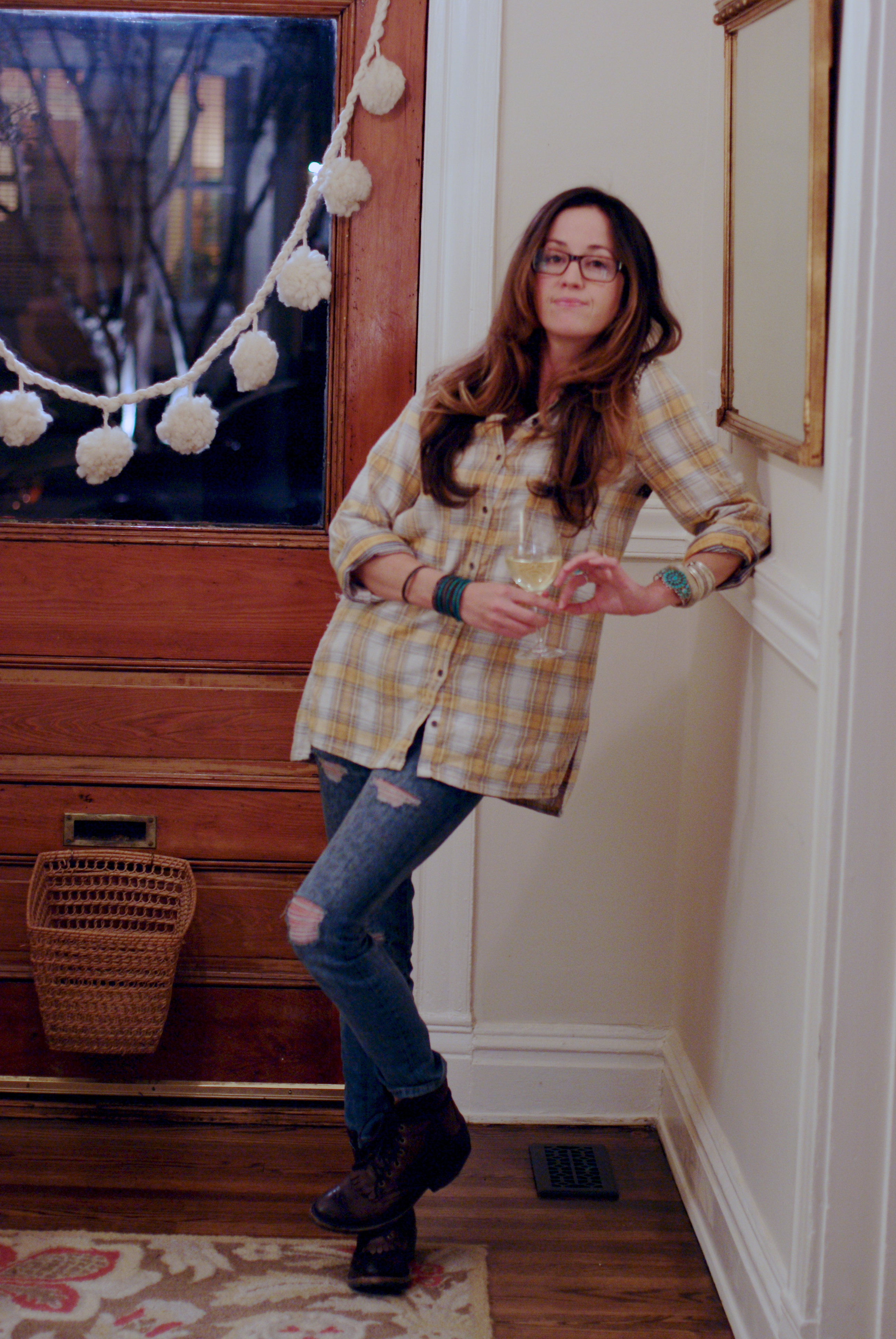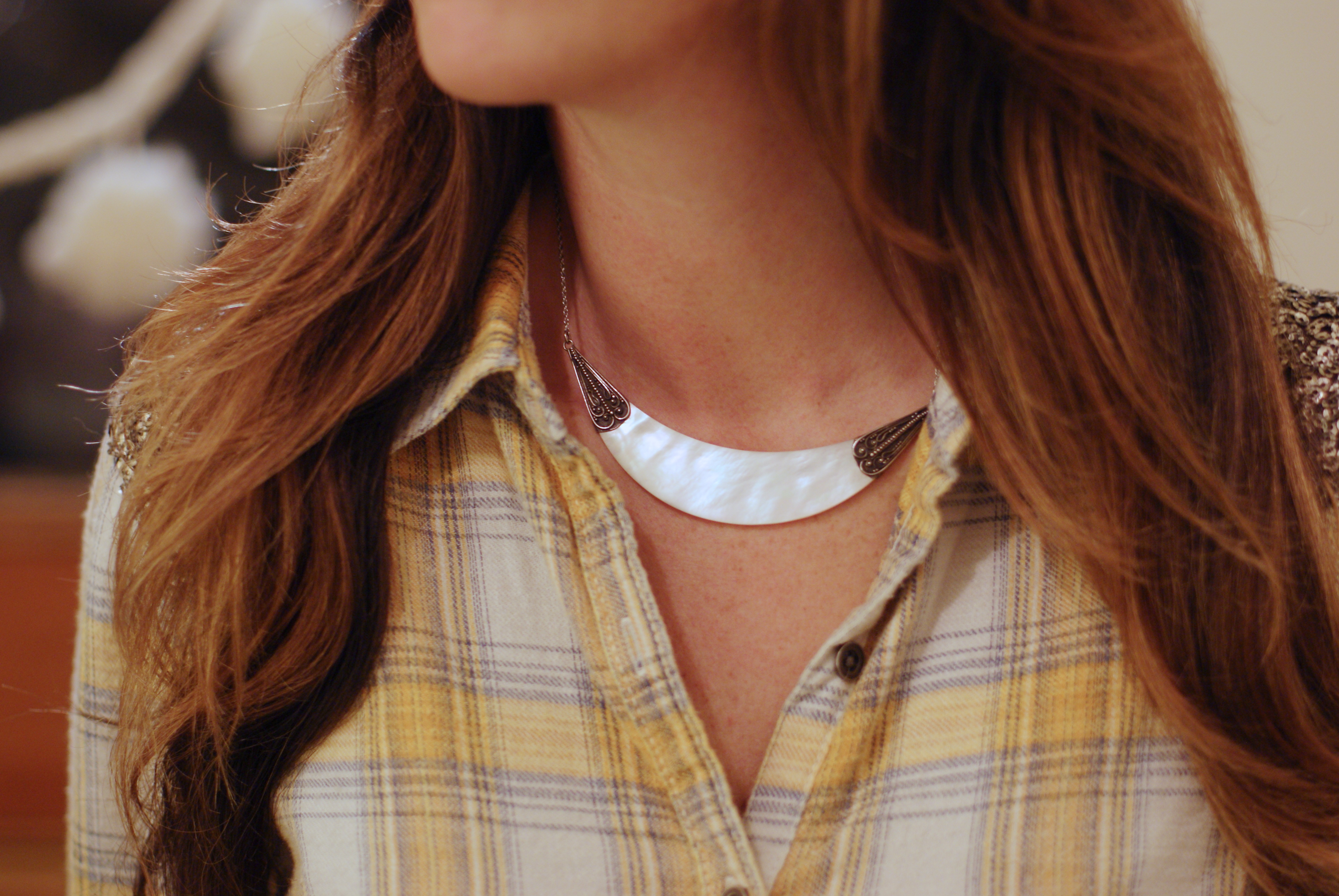 [Antique mother of pearl collar + Free People plaid sequin yoke button down + Current/Elliott stiletto jeans in leopard + some shit kickers.]