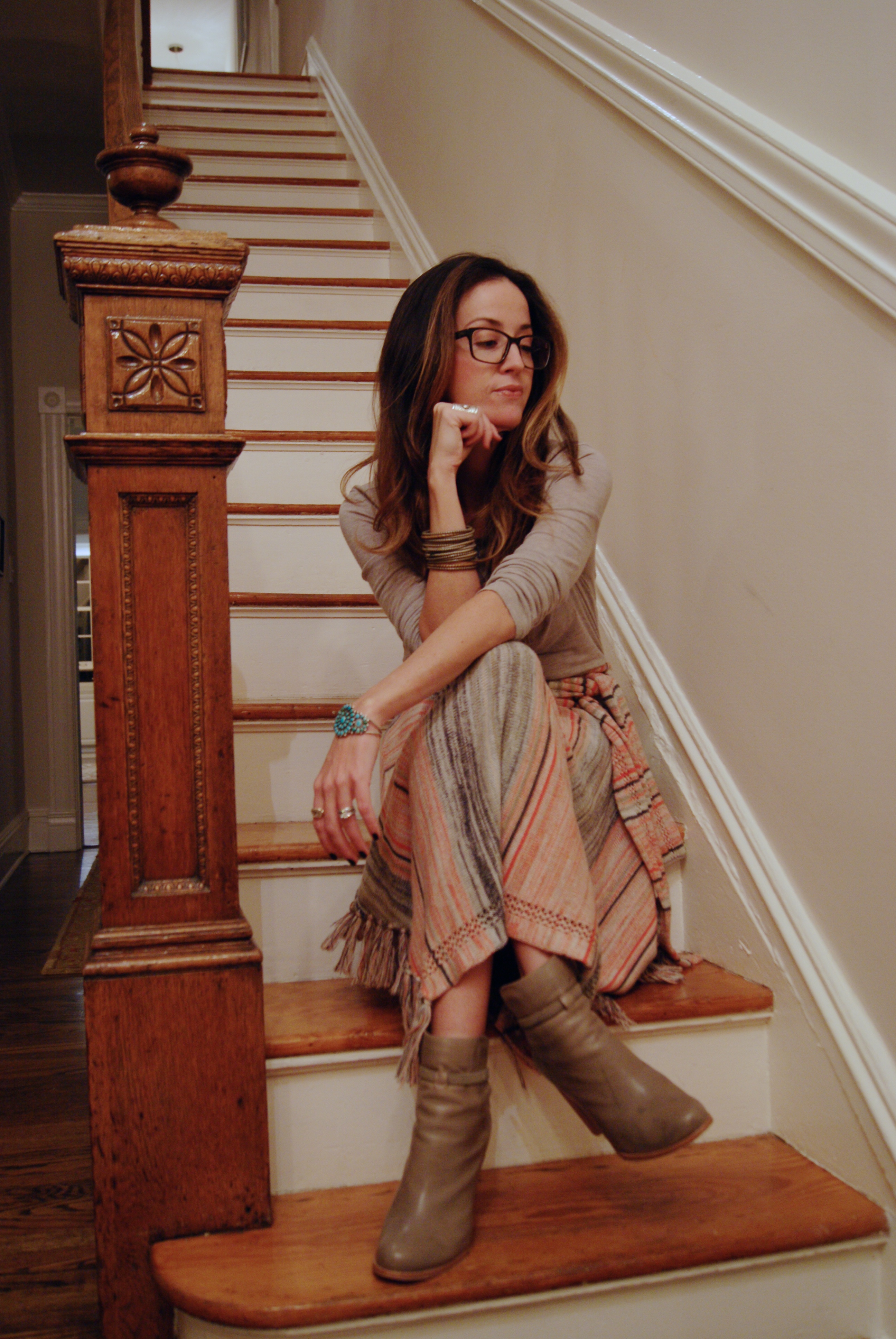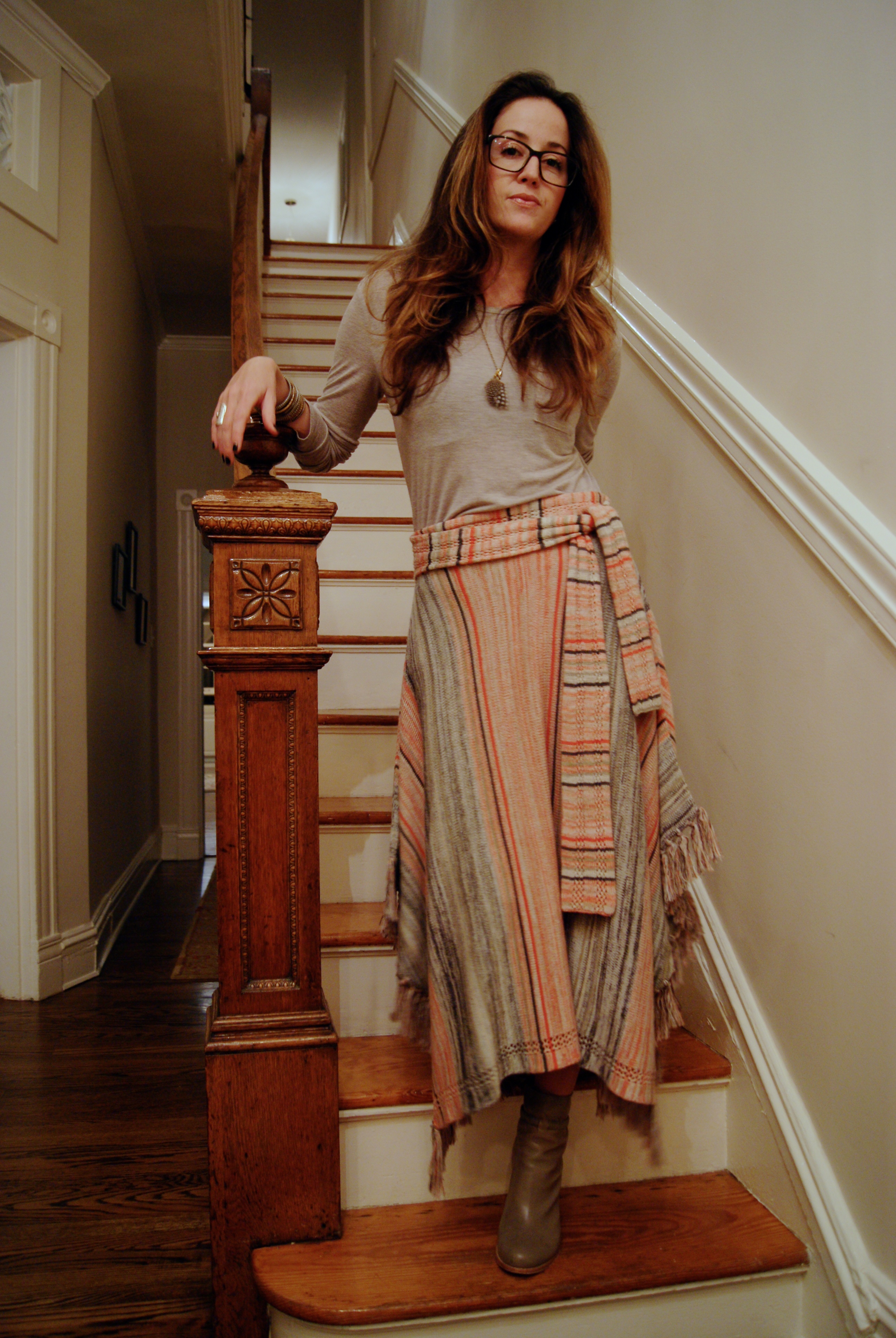 [Sparrow blanket skirt from Anthro + T by Alexander Wang classic long sleeved pocket tee + Joie booties + Warby Parker Nash glasses.]