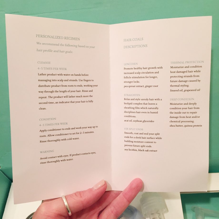 The premise: For $36 to start, you select three descriptors of your hair type so they know what they’re working with, then choose five hair goals, pick a color, then pick a fragrance—mild, medium, or strong. You get these (pretty big, TBH) bottles and pumps with a little write-up about the (all natural) ingredients that were specifically chosen for your lid, with your NAME on the side.
