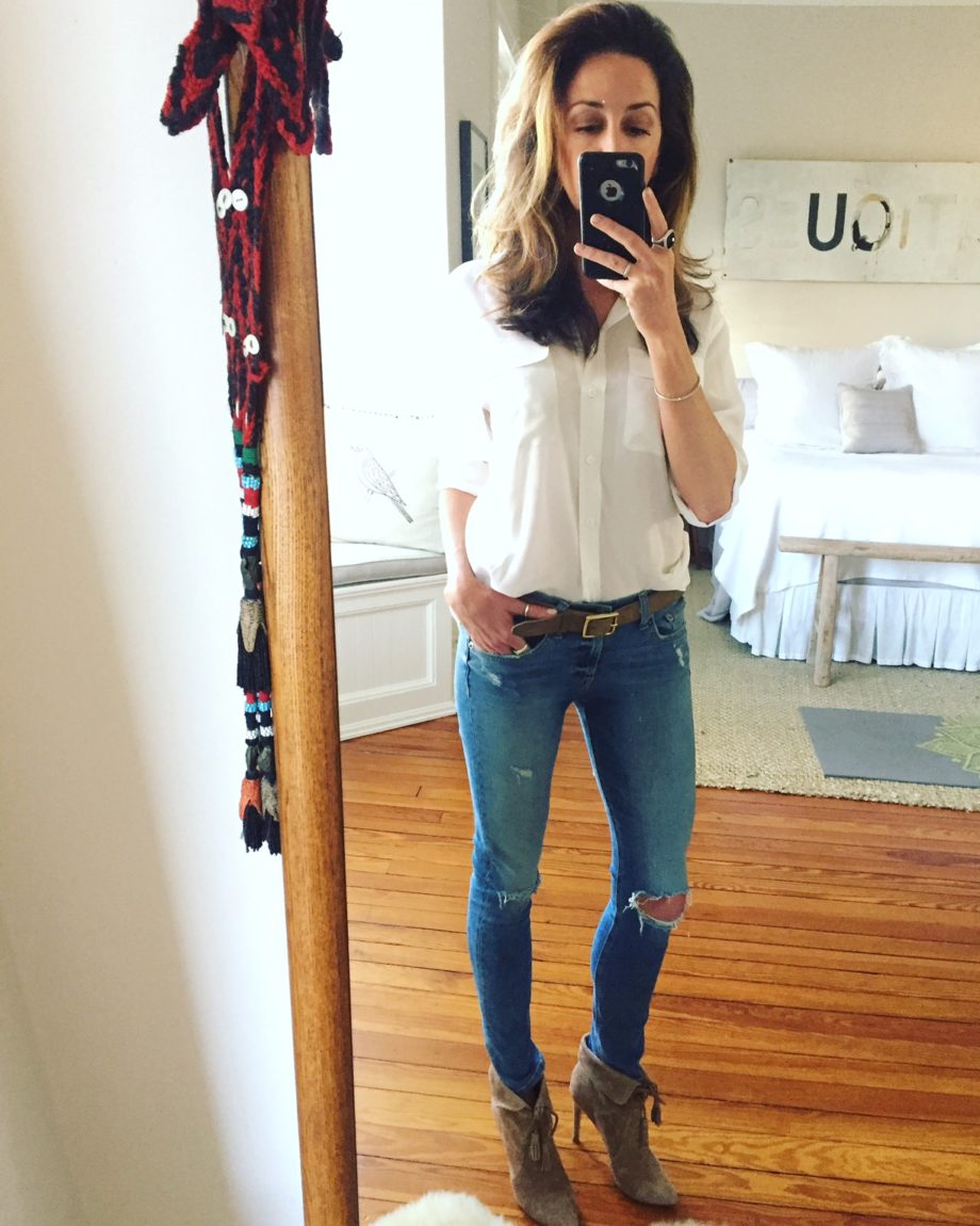 2. Wearing this white silk Equipment shirt all the time. All the time.