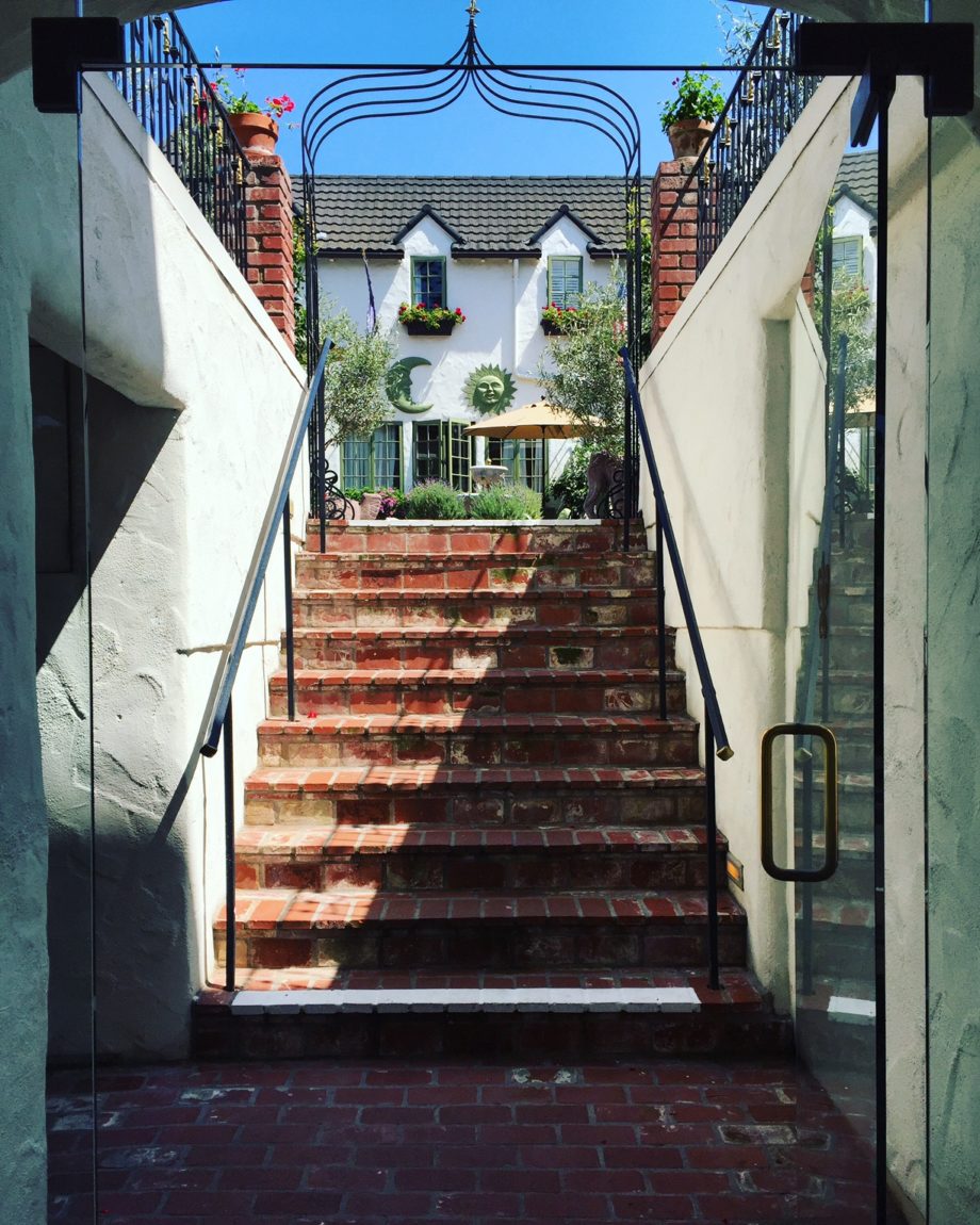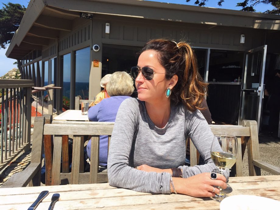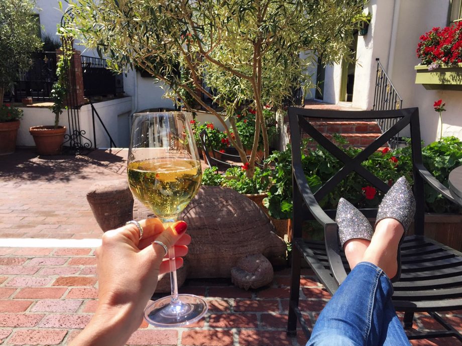 [Sipping some cava in the courtyard of L’Auberge Carmel, a stunning Relais & Chateau property blocks off the ocean in town with the most marvelous staff on the planet. So friendly and fun! Glittering in the sun are my Joie glittery slides that were made for airport travel.]