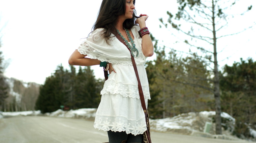 [H&M lace vest + squash blossom necklace + Made with Love bracelets + A Wang tee + J.Crew cords + Joie lace up boots + Gorjana bracelet and pendant.]